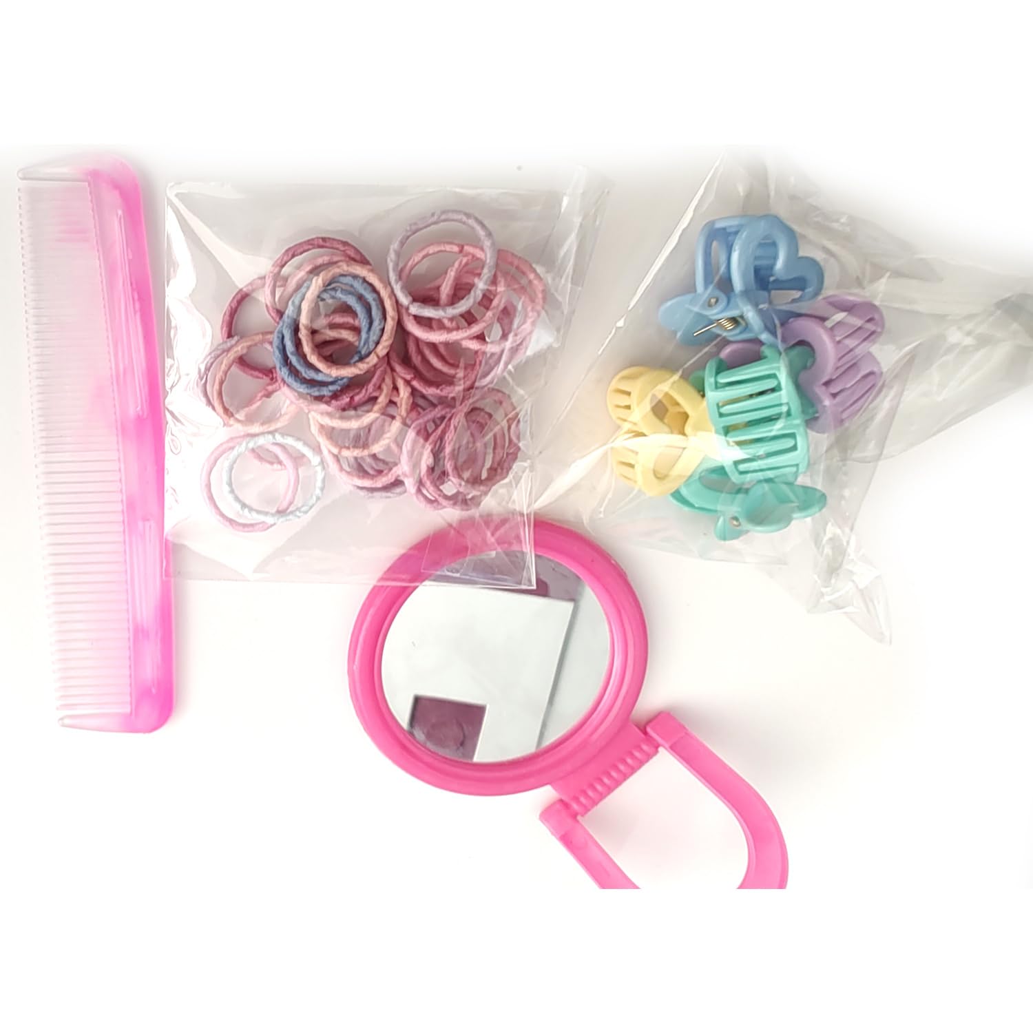 MULTIPURPOSE HAIR ACCESSORY SET – Includes 24 hair bands, 6 hair clips, a mirror, and a comb, providing a complete set for styling and hair care for girls and toddlers.