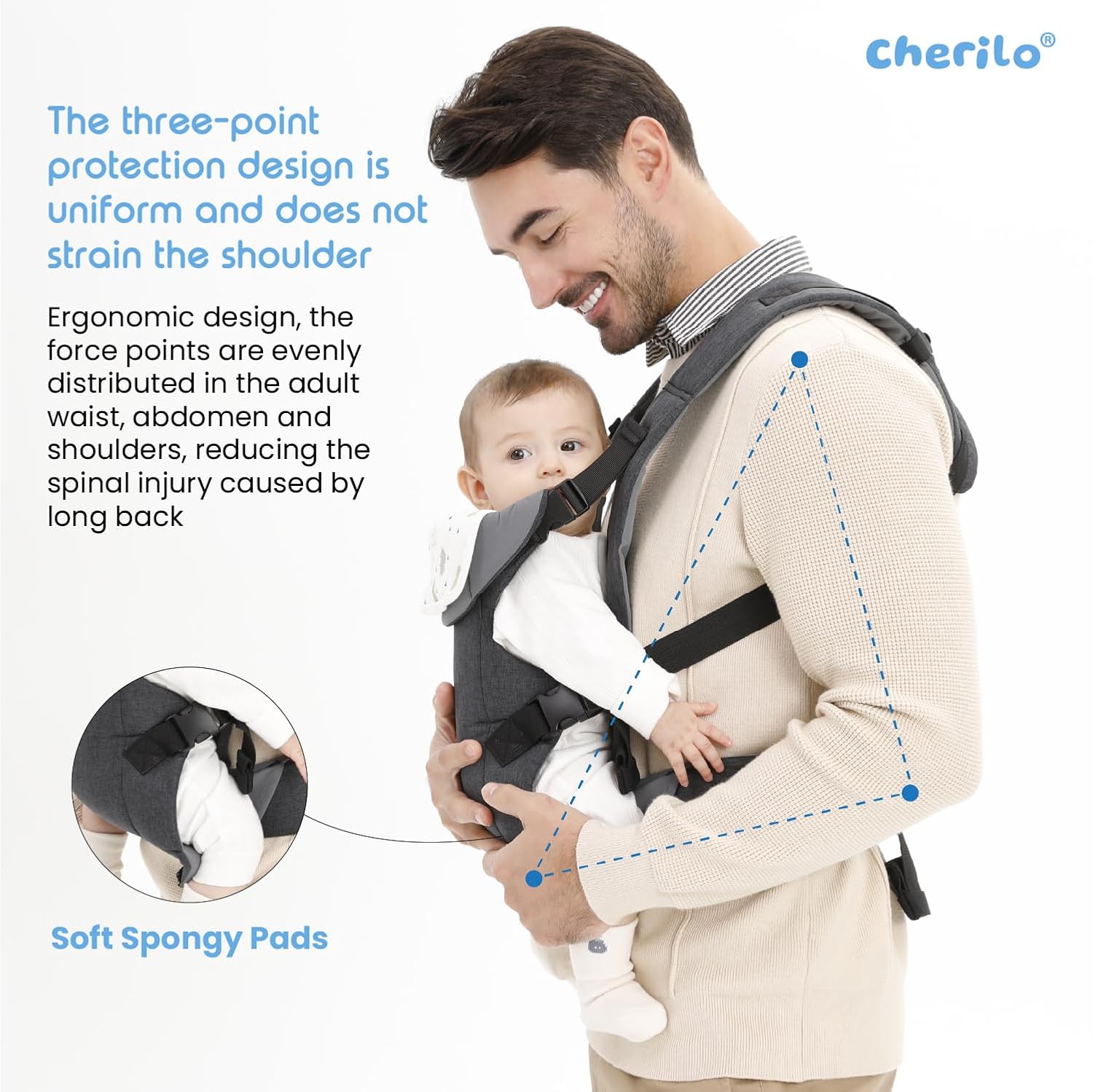The generously padded shoulder straps are fully adjustable and designed to evenly distribute your baby’s weight