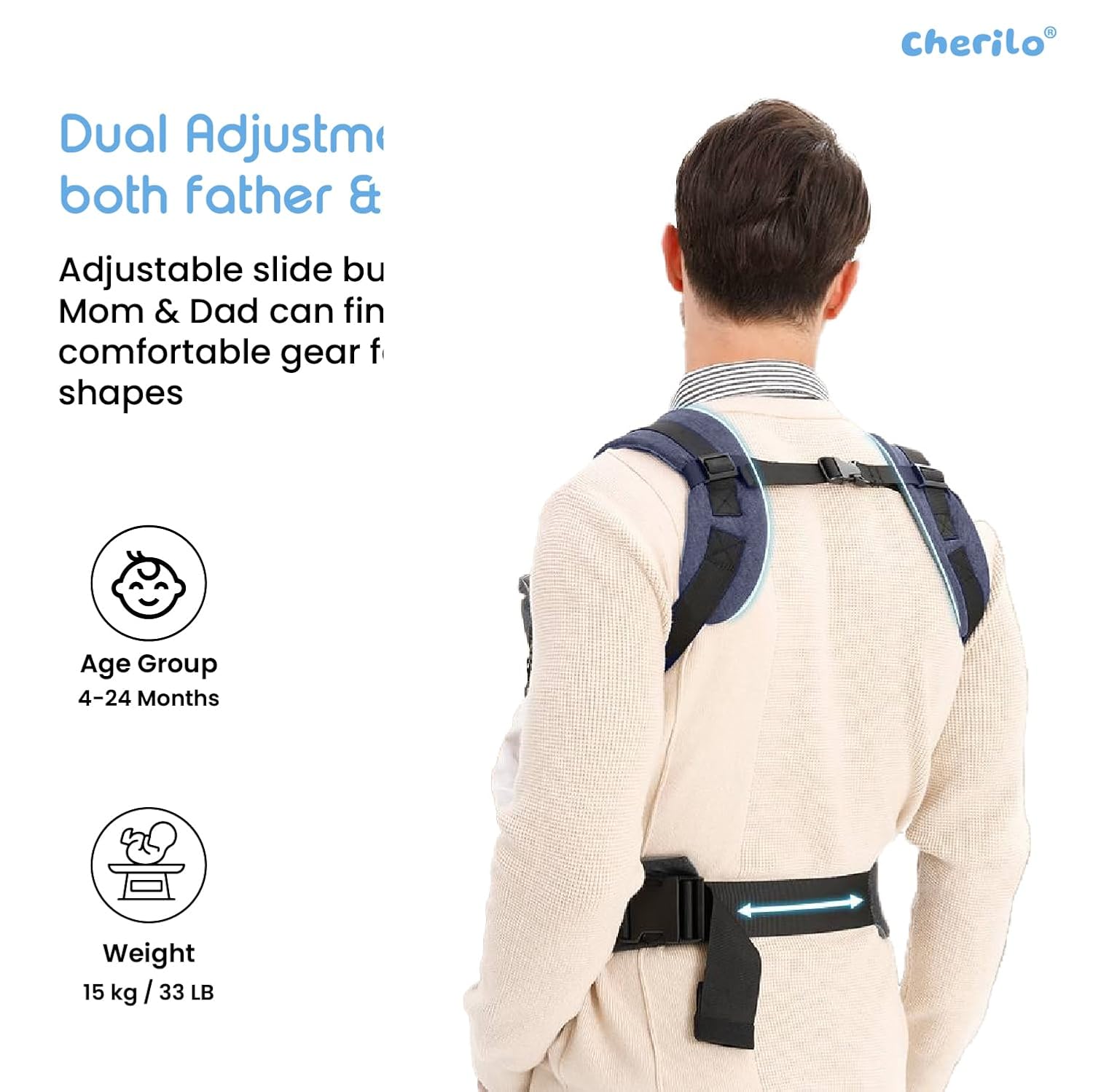 The generously padded shoulder straps are fully adjustable and designed to evenly distribute your baby’s weight