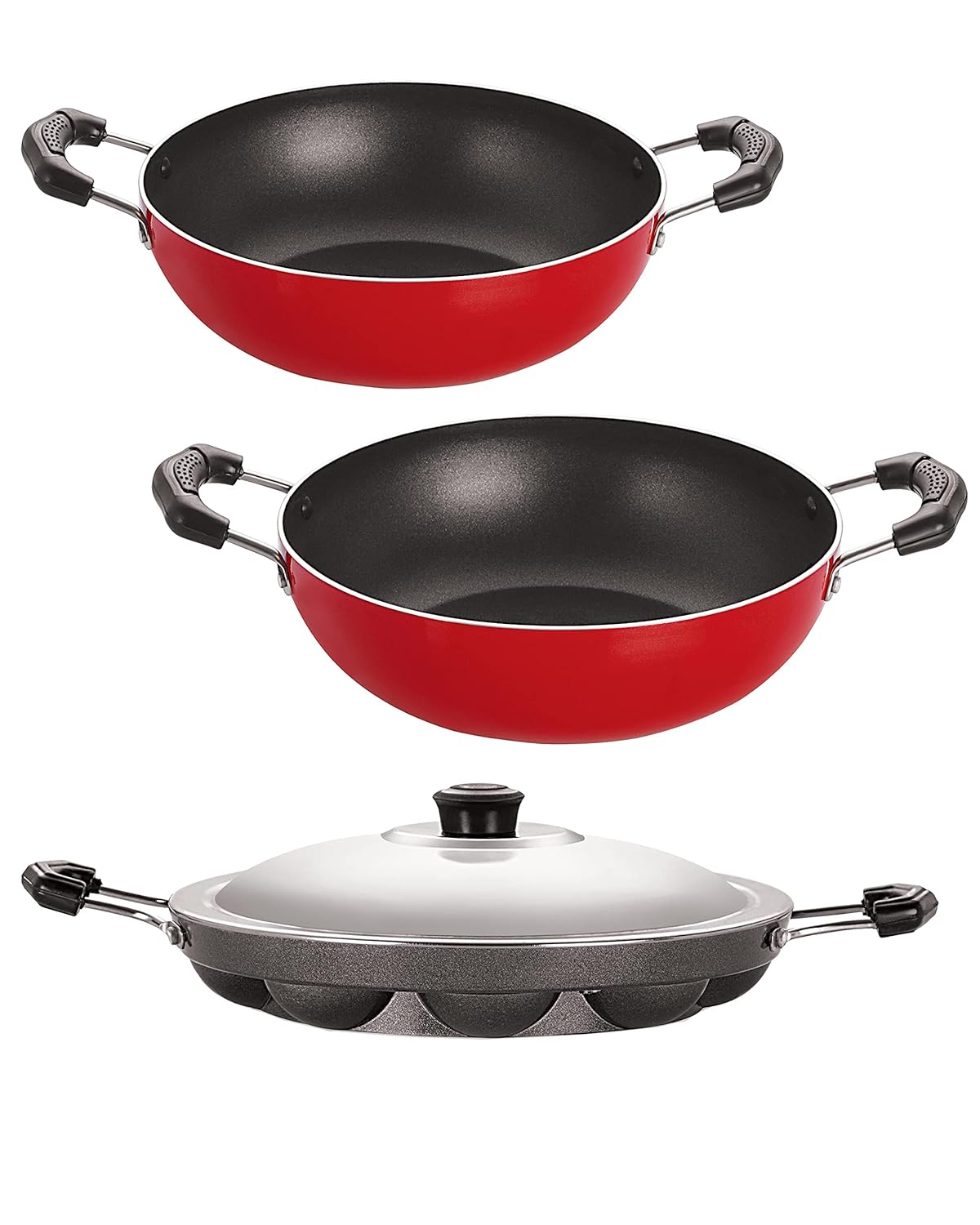 Combo Set of Two Tawas & Kadai (Kadai 2 Liter, Kadai 2.5 Liter, Appam Patram Handle with Lid 12 Pits)