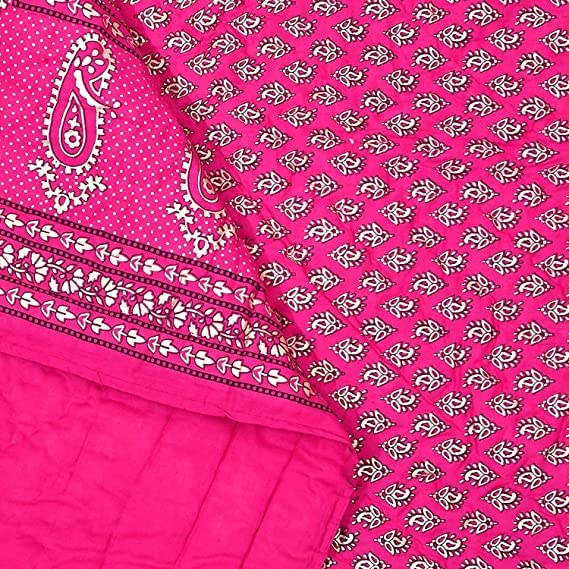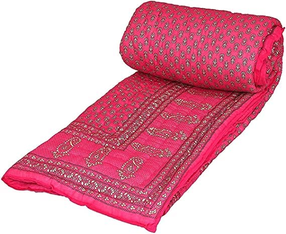 Organic Pure Cotton: Made from 100% organic pure cotton, our Jaipuri razai ensures a breathable, hypoallergenic experience, perfect for those who value natural and bedding.300 Thread Count: With a superior thread count of 300, these quilts offer exceptional softness and durability, providing a luxurious feel that stands the test of time.All-Season Comfort: Designed to be versatile, these quilts offer warmth during the winter and remain lightweight for use in the summer, ensuring comfort throughout the year.Rajasthani Craftsmanship: Handcrafted by skilled artisans, each quilt showcases traditional Rajasthani designs, adding an element of cultural heritage to your bedroom.Soft and Lightweight: The high-quality cotton ensures a soft, fluffy texture, making the quilt light and comfortable without sacrificing warmth.Perfect Size: Measuring 85 x 55 inches, these quilts are perfectly sized for single beds, providing ample coverage and comfort.Elegant White Color: The classic white color adds a touch of sophistication and tranquility to your bedroom, complementing any decor style effortlessly.Pack of one: This convenient pack of two ensures you always have a spare quilt on hand, whether for guests or for alternating between washes.