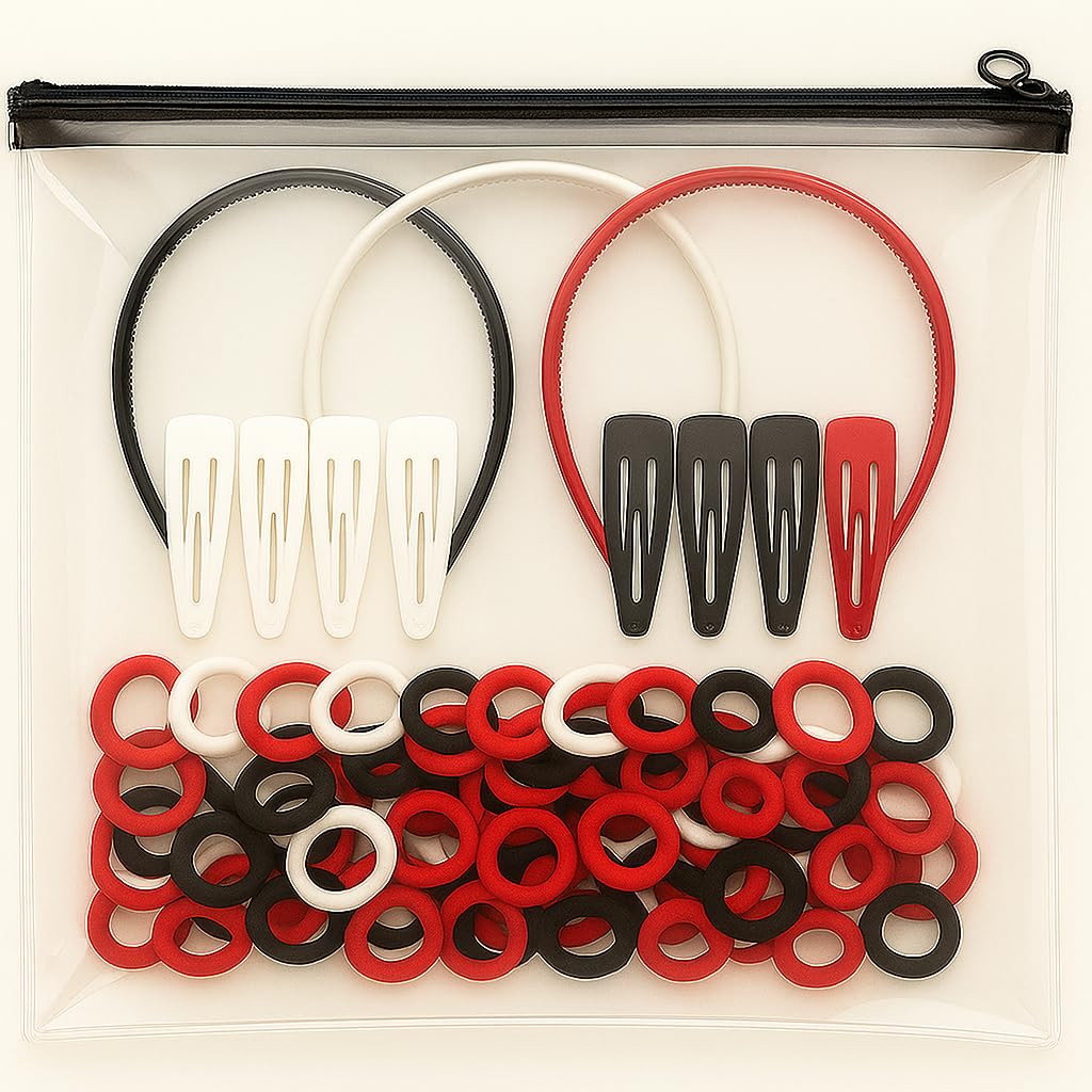 Complete Combo Pack – Includes 100 pcs strong elastic rubber bands, 30 pcs mini tic tac clips, and 3 pcs durable hairbands – all in matching red, black & white colors.