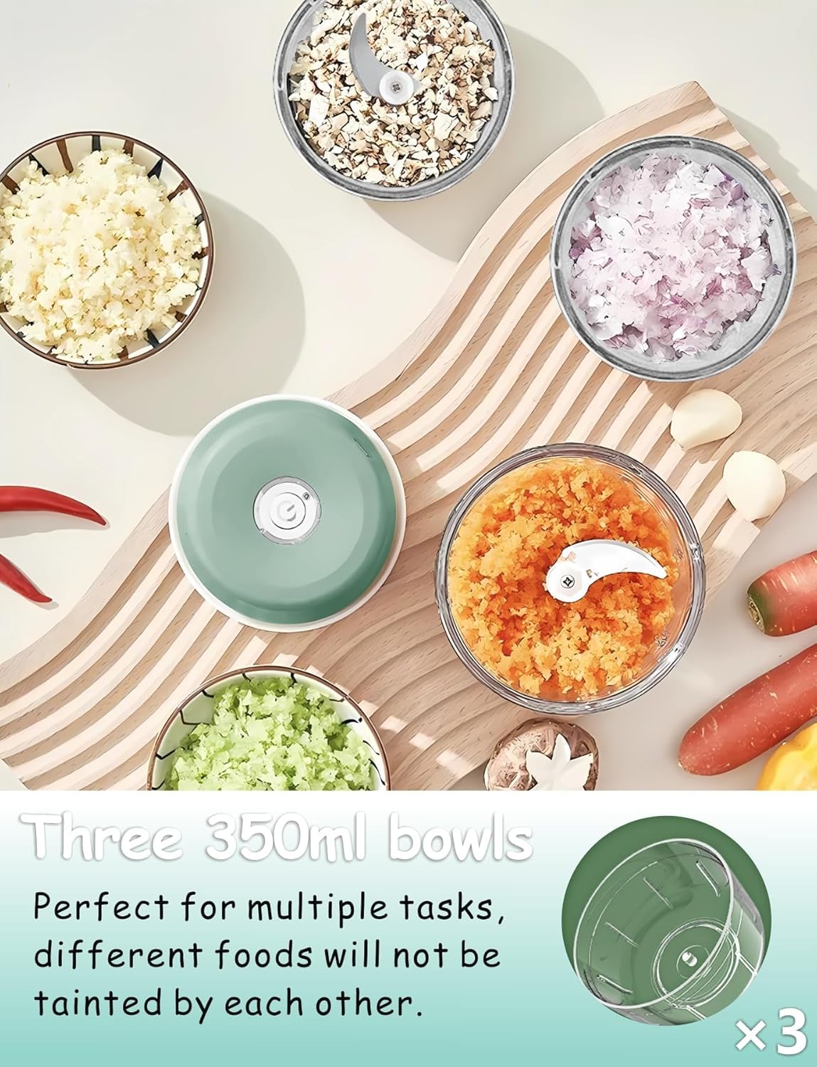Cordless Food Processor Set with Multiple 3 350ml Bowls & 2 Blades, Mini Food Chopper Battery Operated, USB Rechargeable Garlic Chopper, Wireless Electric Vegetable Meat Blender Mixer