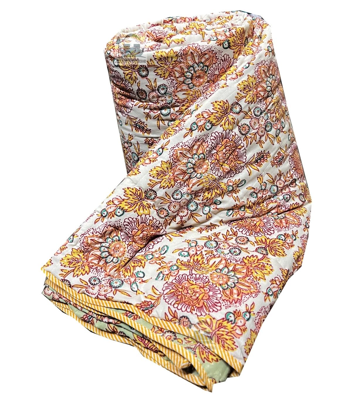 Cotton Quilt 400 GSM Rajasthani Traditional Jaipuri Hand Block Print Summer and Winter Cotton Single Bed Rajai Quilt Razai – Orange/Green