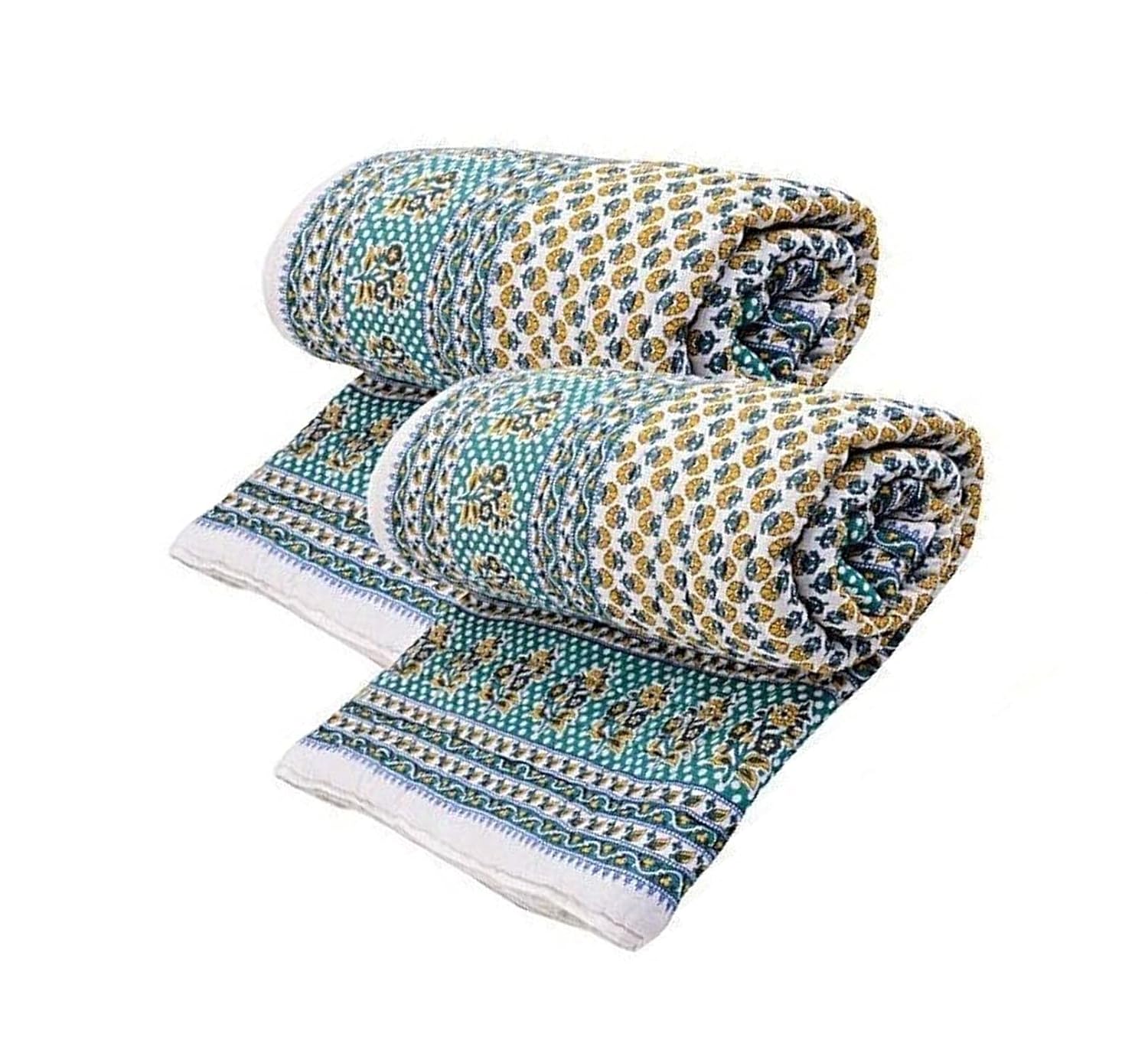 Hopee Shop, Size-Single Bed, Hopee Shop Presents World famous Jaipuri Razai (Quilt) in traditional print of Rajasthan. Jaipuri quilts/Razai are characterized by their incredible feather-weight lightness, softness and warmth. The brightly colored Jaipuri Quilts can enhance the decor of your bedroom while providing an unmatched level of comfort to you and your family. This cotton Quilt possess a beautiful print pattern that has been further accentuated with intricate Handblock print. The Hand made print pattern is a Indian art form of the orient and is sure to spruce up the look of your bed room décor. Prefect for usage in Winters and in Air-Conditioned rooms Material: Handblock Printed 100% Cotton Fabric & other side Matching Plain cotton Soft,Pure Cotton & light weight Jaipuri Rajai/Quilt.100 percent microfibre shell for a rich luxurious feel Hand Made by skill artisans with the highest quality Pure Cotton with Jaipuri Prints to create a beautifully soft texture & good Looking.