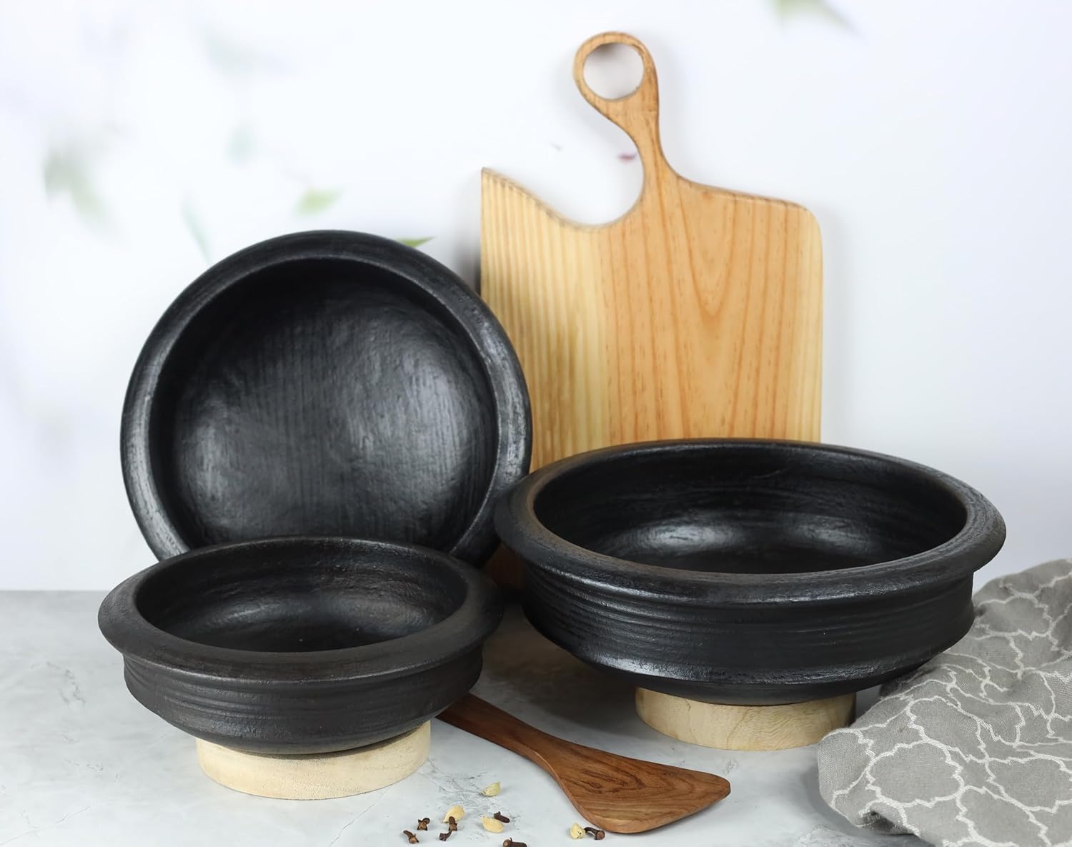 Deep Burned or Black Pottery is hand crafted using an age old Pottery technique. A Normal red Clay pot is Kilned once where as Deep Burned Pots are kilned two times, Second time, potters Burn the pots stacked together with wood and Hay at a temperature Nearly 1200*C. This will Make the pots very strong and Durable. During the process Pots turn Black in colour. Deep Burned Pots Can Withstand High temperature when used on Gas stove.