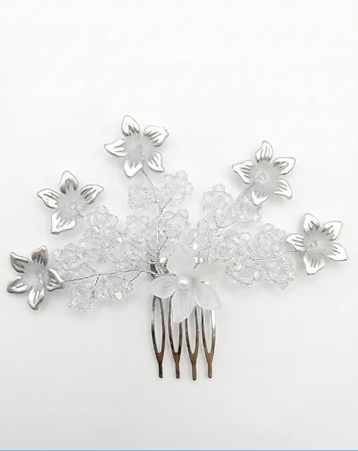 This handcrafted crystal floral hair clip is designed to add a soft, luxurious sparkle to your hairstyle. Featuring delicate flower-shaped beads and shimmering transparent crystals, it is the perfect accessory for brides and special occasions.