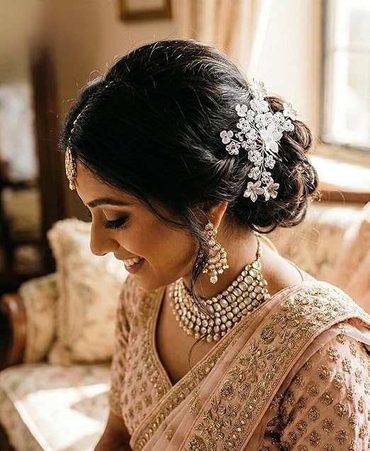 Whether worn as a side hair clip or styled like a tiara, this versatile accessory beautifully complements traditional and modern hairstyles.