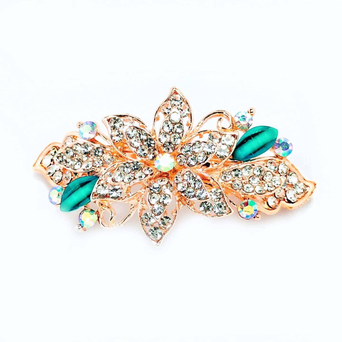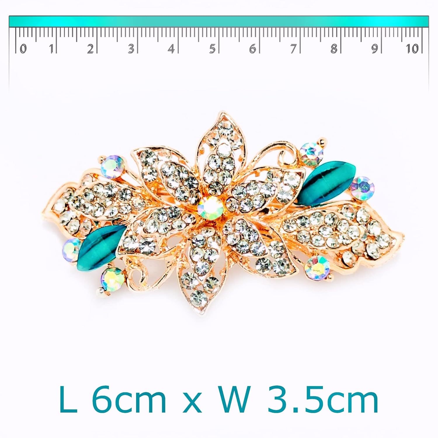 DIMENSIONS – 6 cm x 3.5 cm (length x width). MATERIALS/HIGHLIGHTS – Rhinestone sparkling studs all over, 2 Jade-finish leaves and 8 Turquoise Jade-shine Rhinestone stud highlights. PLATING: High Quality Pink Metal/Rose Gold Tone.