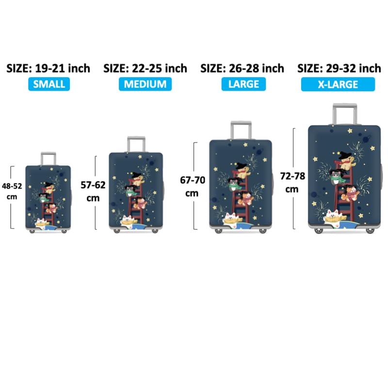 Size and Color:4 sizes available to fit almost any luggage. SIZE S: fit 18-21 inch luggage; SIZE M: fit 22-25 inch luggage; SIZE L: fit 26-28 inch luggage.SIZE XL: fit 29-32 inch luggage . We have many kinds of colours, you can choose the one you like .The colourful cover also helps you find your luggage quickly.