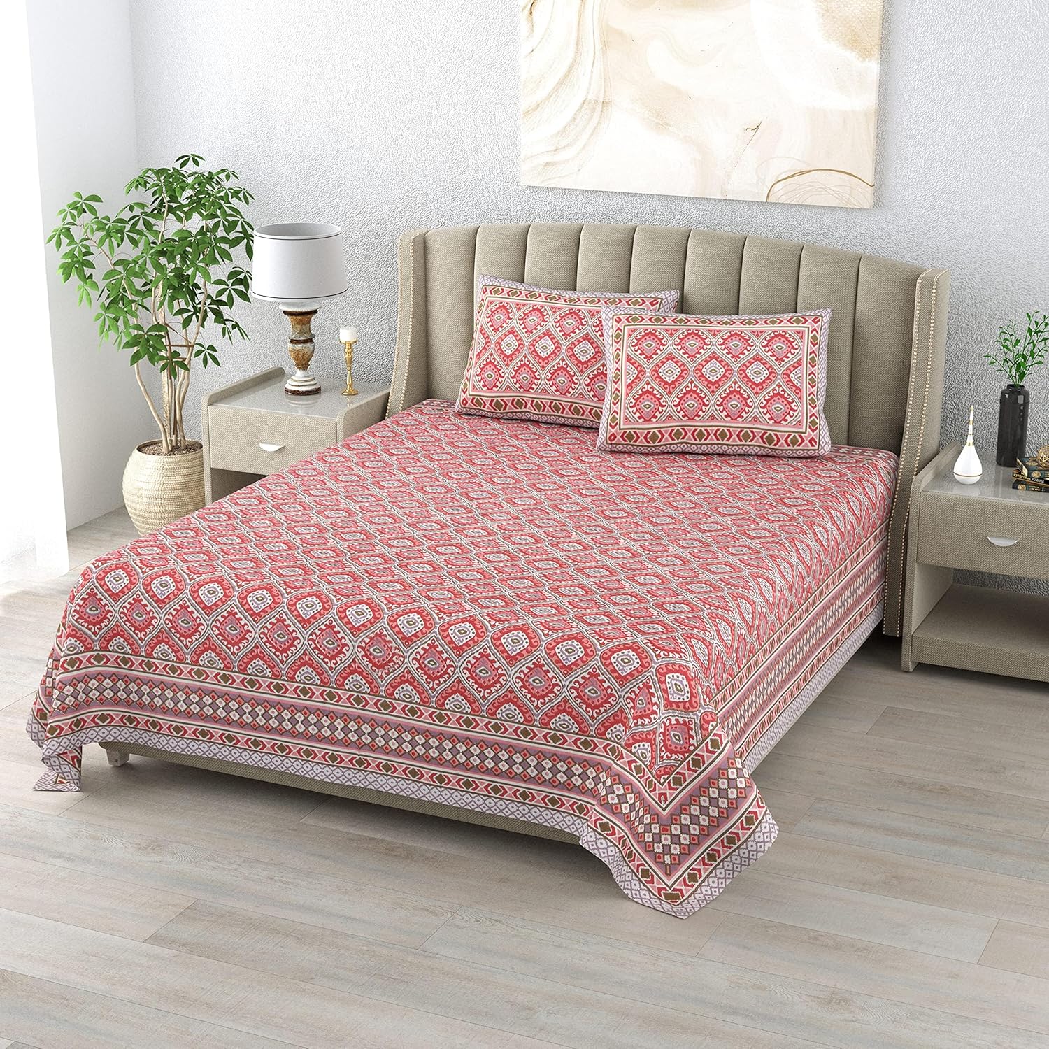 🛏️ {COTTON BEDSHEET SET} – Elevate your sleep experience with our premium king size cotton bedsheet set crafted for double beds. Made with a luxurious 300 thread count, it offers superior softness, smoothness, and long-lasting comfort. Each set includes 1 king size bedsheet (90×108 inches) and 2 matching pillow covers (17×27 inches), giving your room a perfectly styled and coordinated look. Designed to combine everyday functionality with hotel-like elegance.