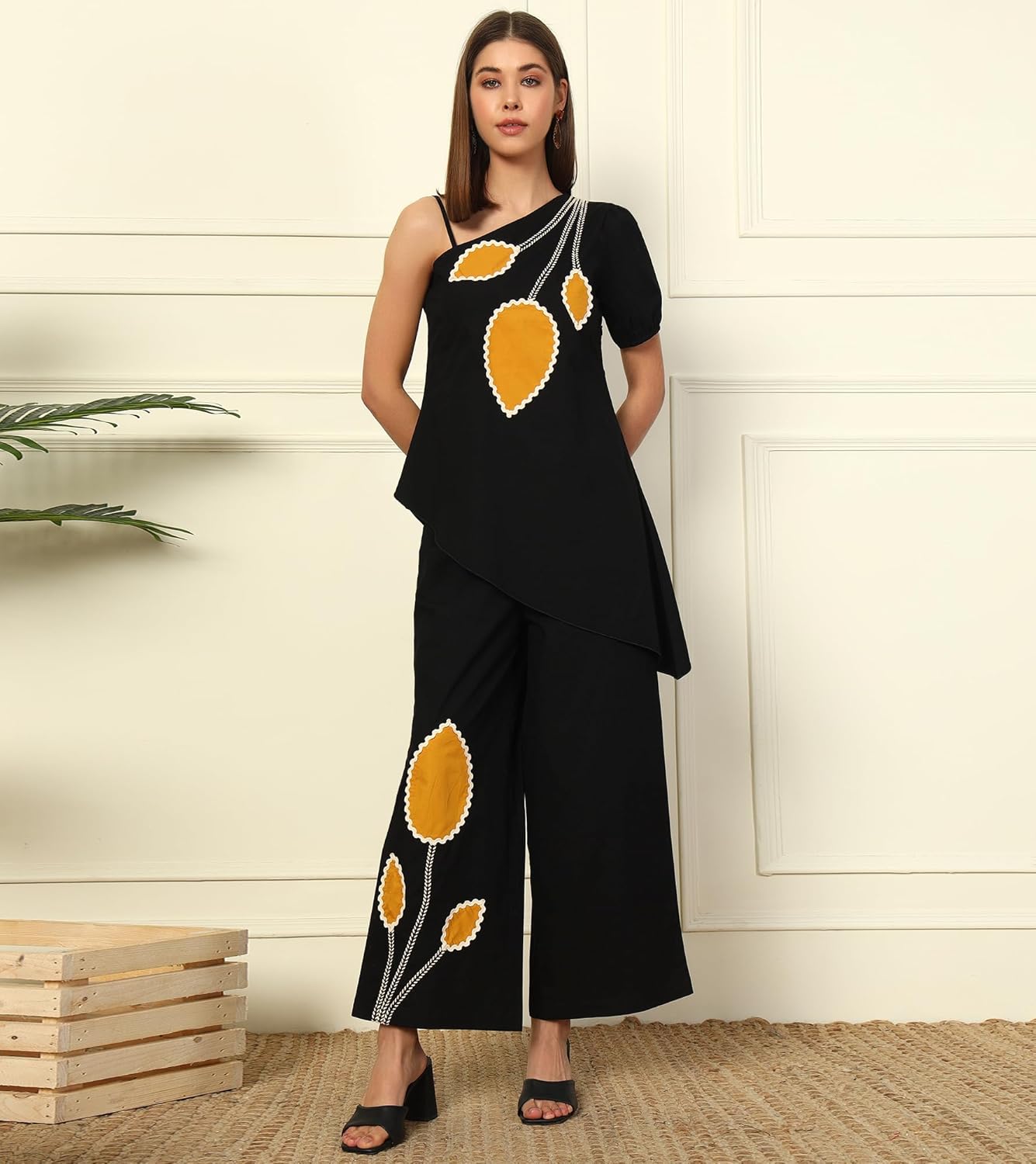 DEEBACO Solid Cotton Asymmetric Tunic With Pants Women’s Co-Ord Set|Puff Sleeves One Shoulder Long Length Regular Fit Summer Western Casual Wear Ladies Cord Set