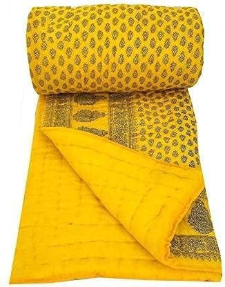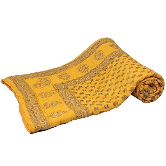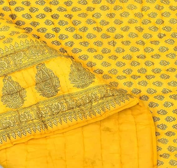 DEILYVERY Hand Made Gold & Silver Printed Jaipuri Razai Dark Blue Cotton Single &Double Bed Quilt Razai Rajasthani Jaipuri Quilt (Yellow Booti, Single)