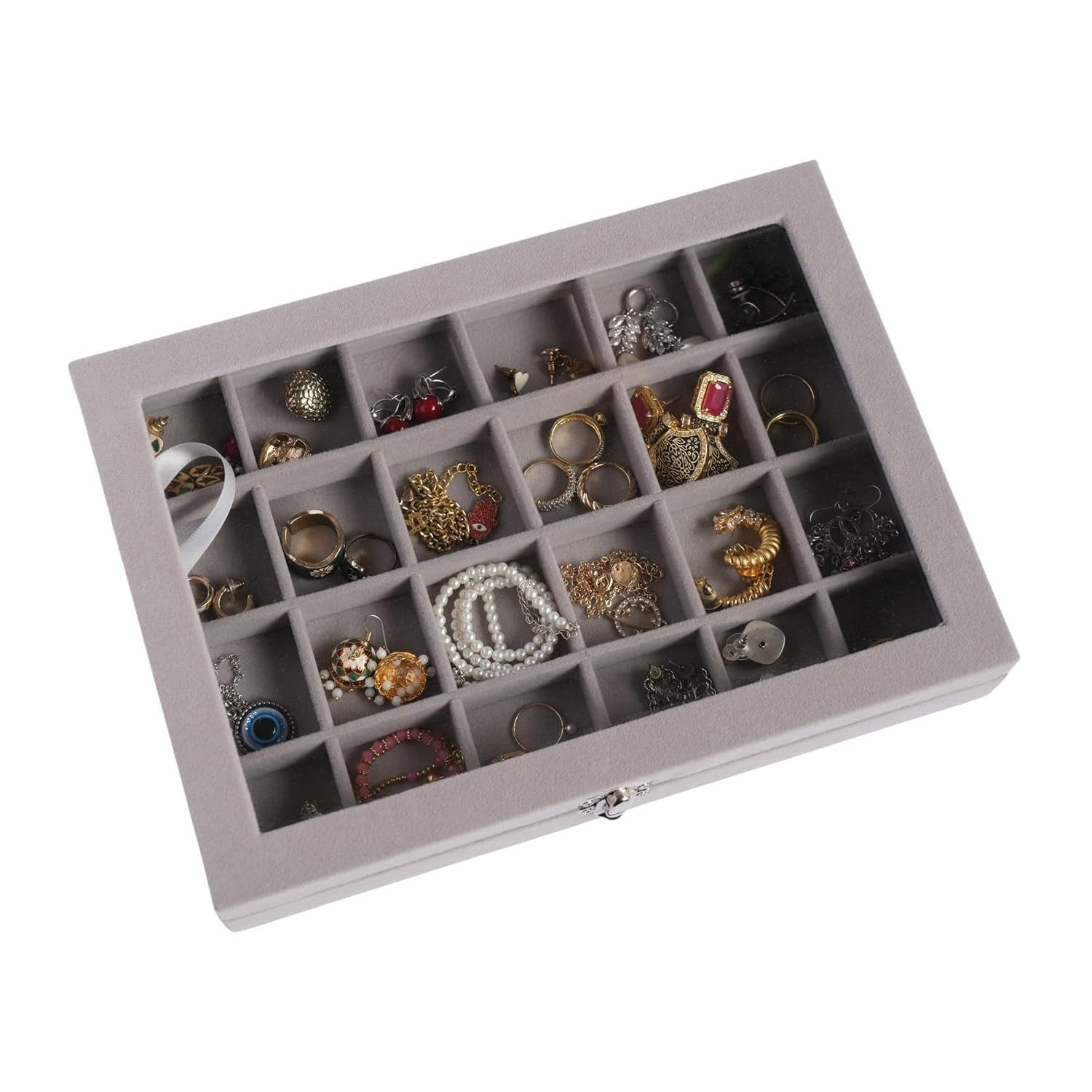 It is made using high-quality velvet and Transparent Acrylic Top, making it suitable to last longer. This elegant organiser box features 24 grids, which can be used to store various small jewellery such as rings, earrings, pendant, chains etc