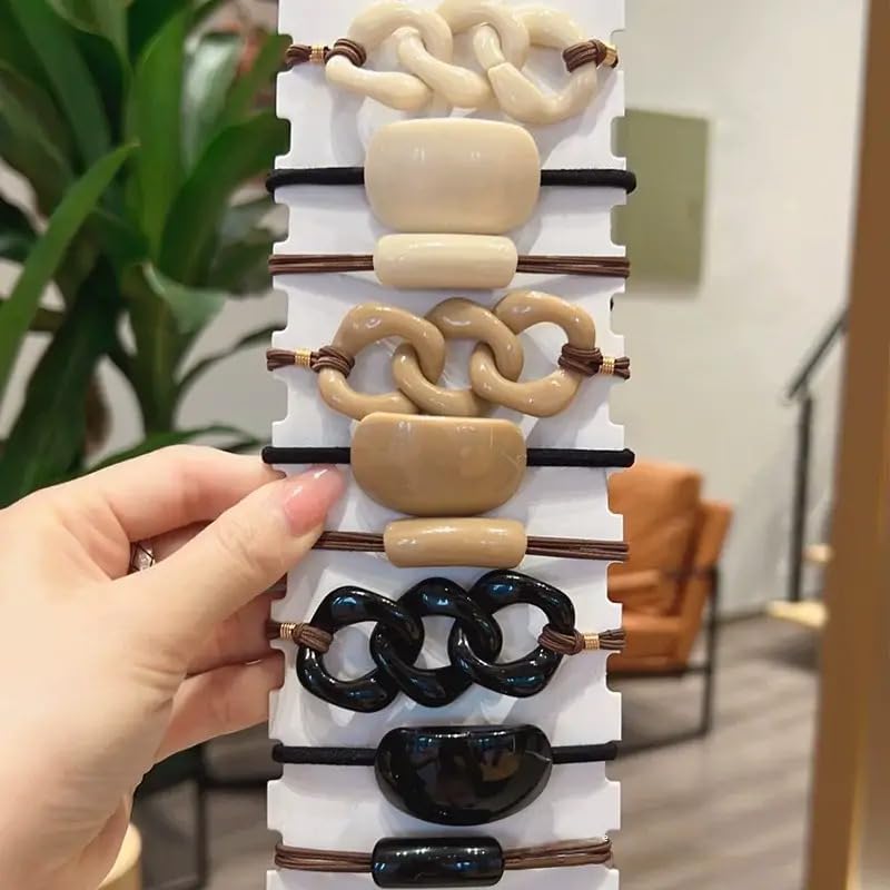 Say goodbye to boring hair ties and hello to elegant function meets modern style. The Diversa Hair Bands combine strong, snag-free elastic with bold geometric resin accents in classic tones – coffee, black, and beige – to complement every outfit and occasion.