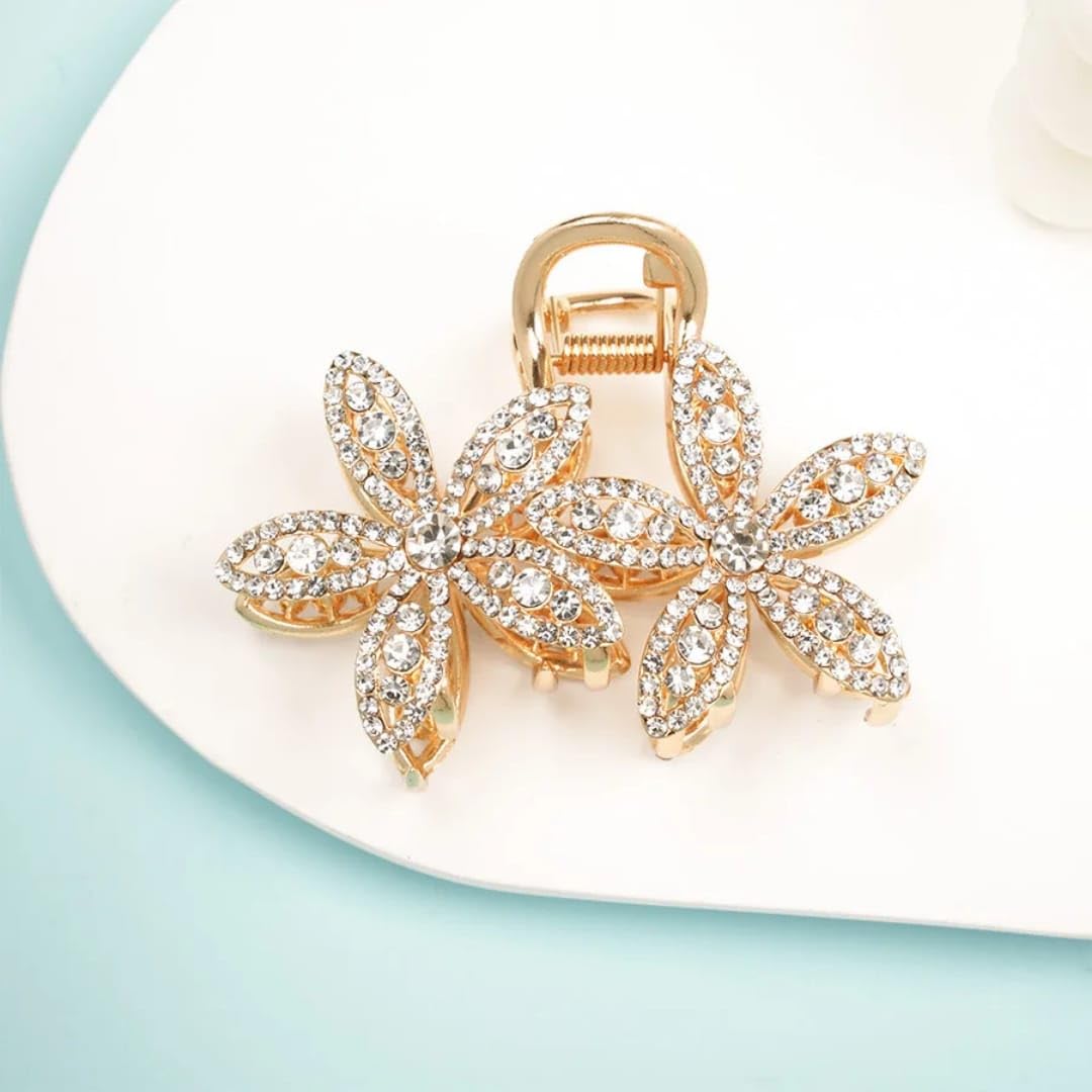 This beautifully crafted claw clip is adorned with sparkling rhinestones and finished in a classy golden tone, making it a perfect accessory for women who love to blend elegance with modern fashion. Its tulip-inspired design adds a unique charm to every hairstyle.