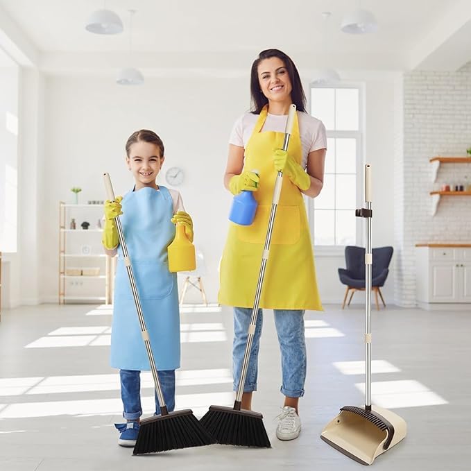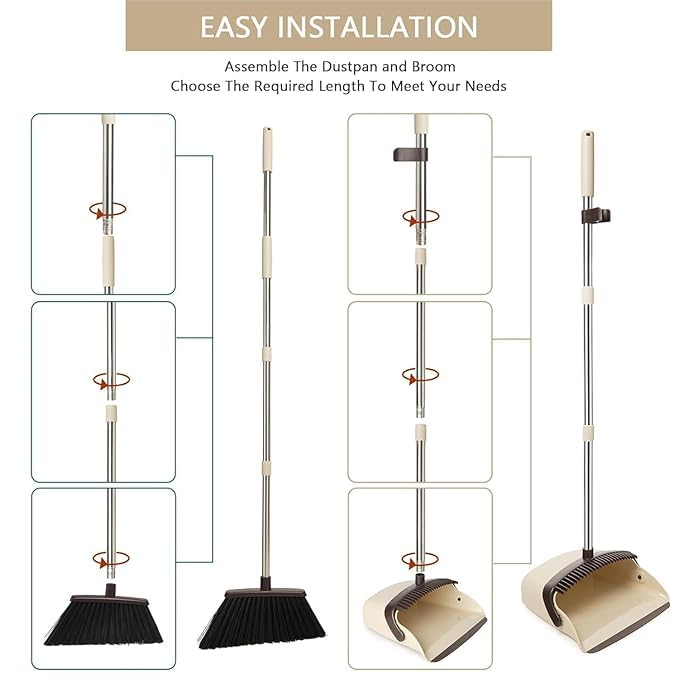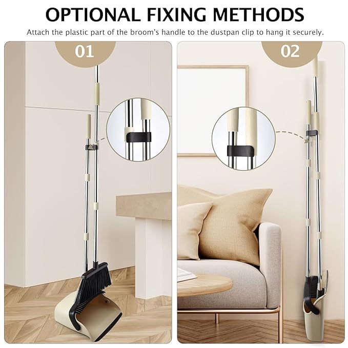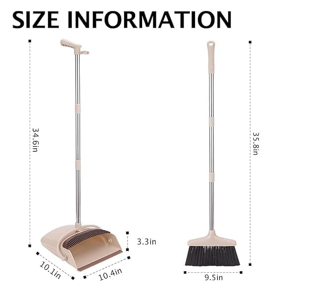 The Household broom dustpan set has built-in comb teeth to easily scrape human/pet hair and trash from the broom into the dustpan without dragging by hand.