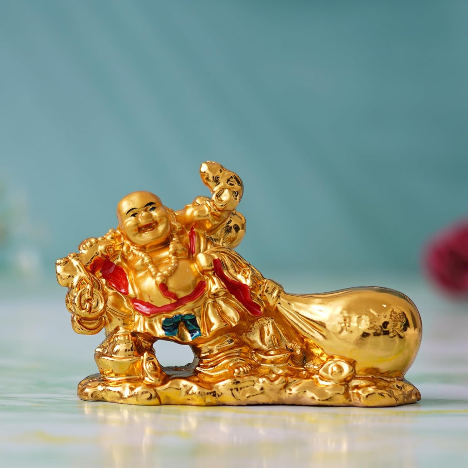 eCraftIndia Golden & Red Feng Shui Laughing Buddha Statue with Money Bag Decorative Showpiece for Health, Wealth, and Happiness for New Year, Diwali, and Loved Ones