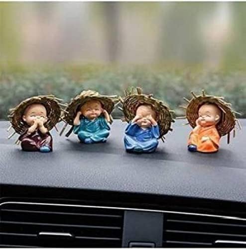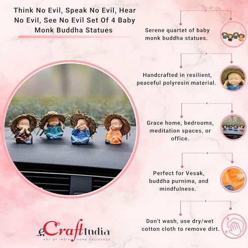eCraftIndia Think No Evil, Speak No Evil, Hear No Evil, See No Evil Set of 4 Baby Monk Buddha Statue with Hat Decorative Showpiece for car Dashboard