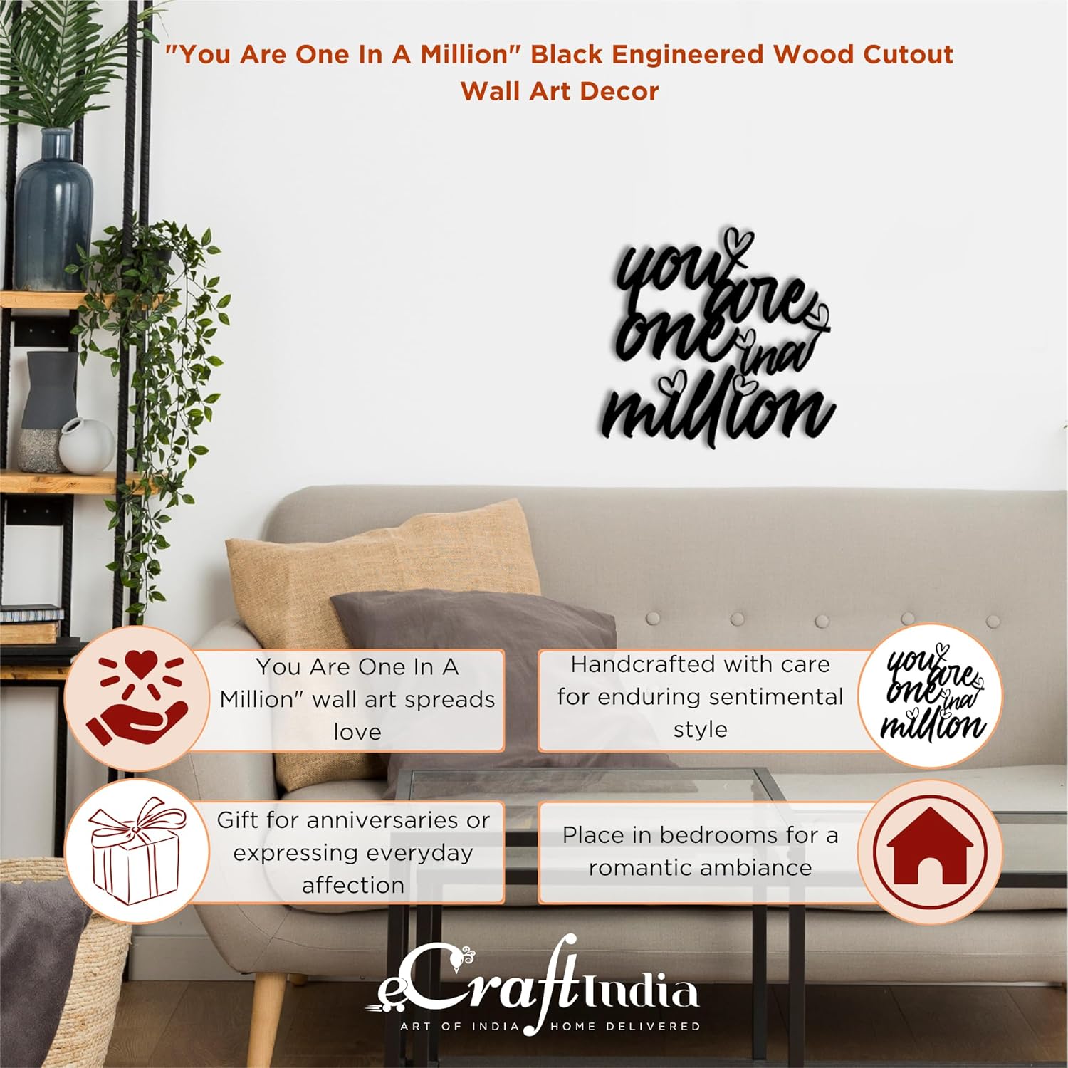 eCraftIndia You Are One In A Million Black Engineered Wood Cutout Wall Art Decor| Wall Decoration Item| Home Decor for Living Room Bedroom| Gift for Diwali Valentines Day
