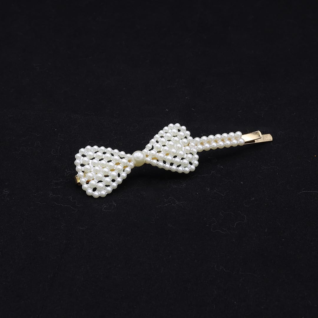 ELEGANT DESIGN: Beautifully crafted bow-shaped hair clip featuring an intricate beaded pattern made with white faux pearls and gold-toned metal base