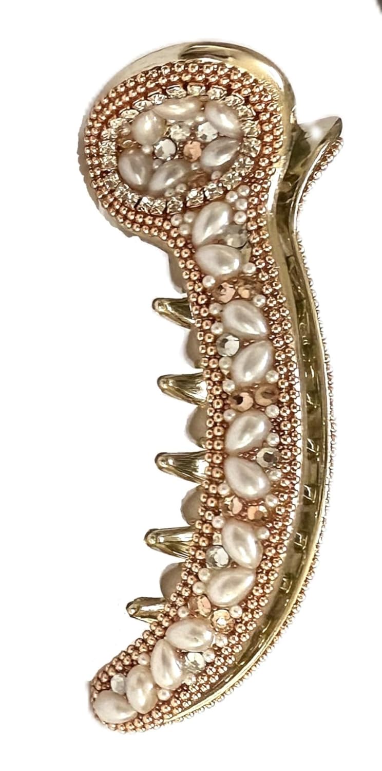 Add a touch of vintage glamour to your hairstyle with this exquisite curved banana hair clip. The elegant design features lustrous faux pearls meticulously arranged along the curved surface, complemented by sparkling crystal accents that catch the light beautifully. The gold-tone metal setting creates a sophisticated backdrop for the ornate detailing, while the secure clip mechanism ensures your hair stays perfectly styled. The clip’s intricate beaded border and artistic arrangement of pearls and crystals make it a stunning accessory for special occasions, weddings, or whenever you want to elevate your look. This versatile hair accessory works wonderfully with both casual and formal attire, adding a classic feminine touch to any ensemble. The substantial size and curved shape make it perfect for securing medium to thick hair in various stylish arrangements. Each detail has been carefully crafted to create a timeless piece that combines both functionality and decorative appeal.