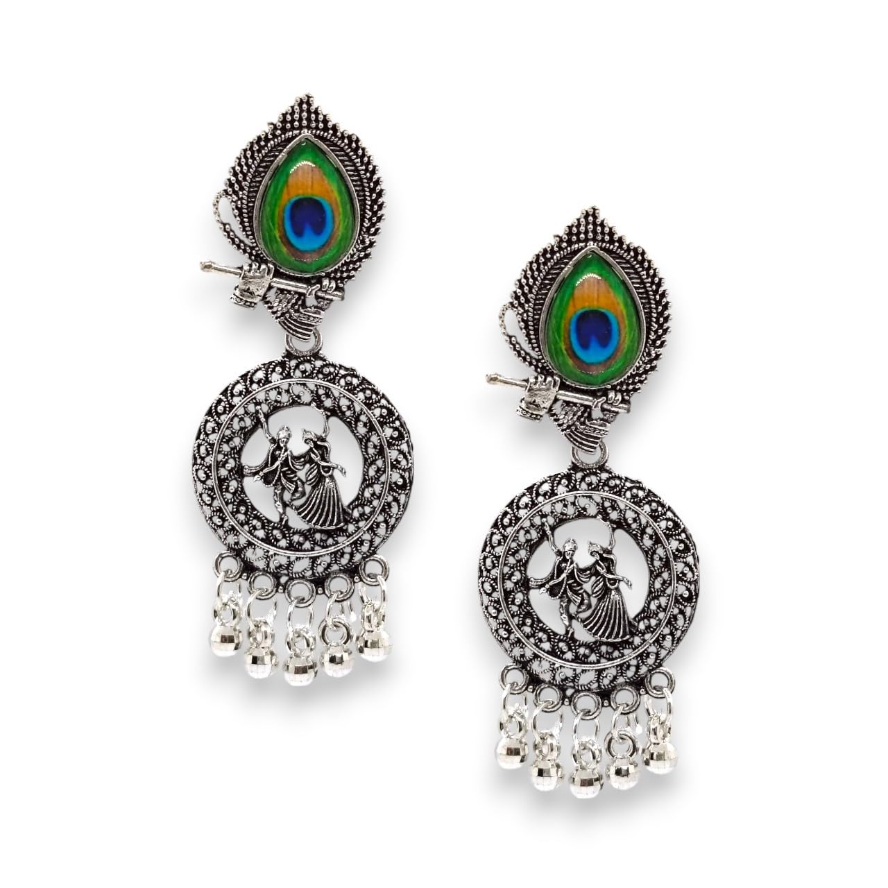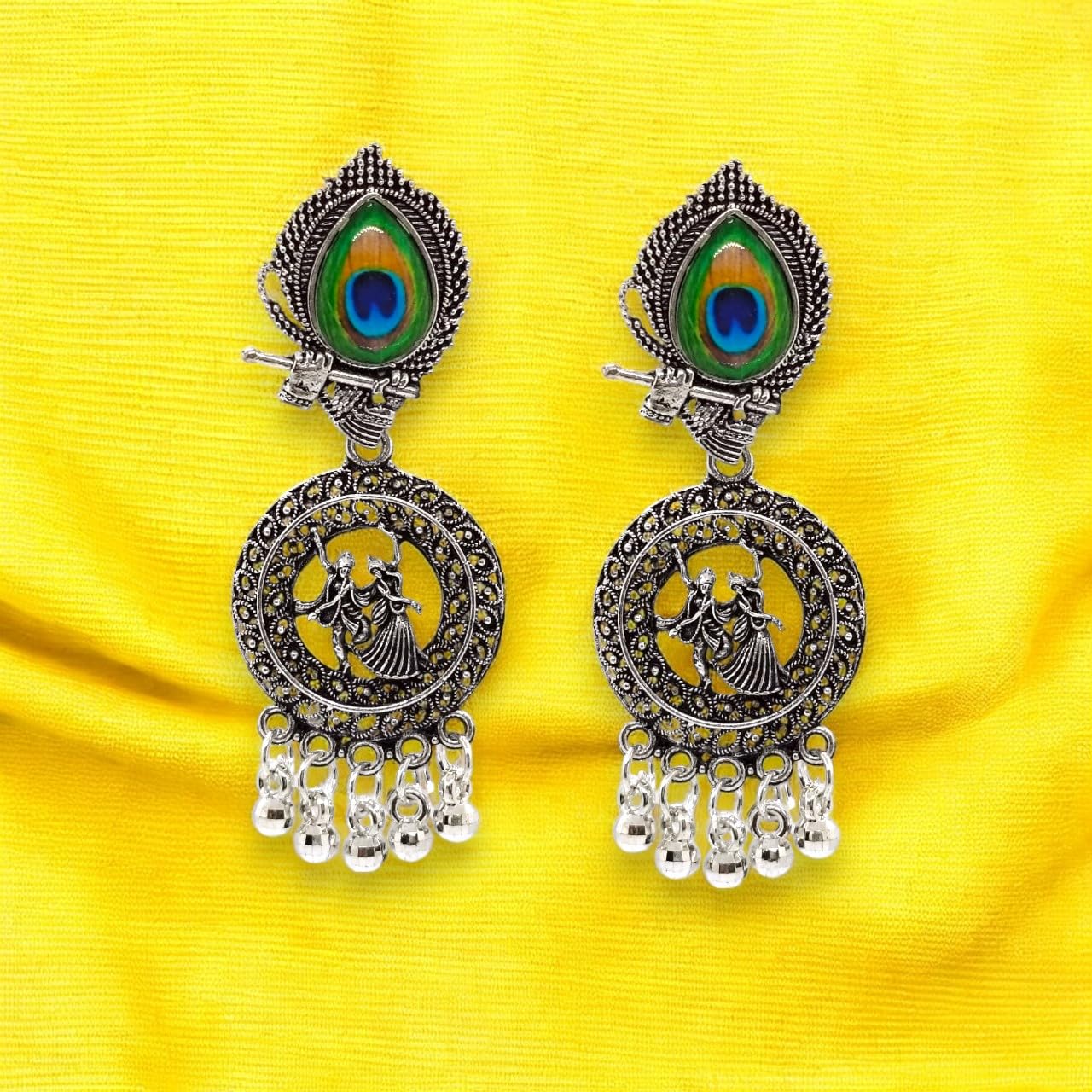 Oxidised Peacock Jhumka Earrings for Women | Small Radha Krishna Earring for Girls Silver Traditional Fashion Jewellery Earrings Studs for Gift Add a touch of elegance and cultural charm to your jewellery collection with our Oxidised Peacock Jhumka Earrings for Women. These stunning earrings combine traditional craftsmanship with modern style, making them the perfect addition to any outfit. Whether you’re dressing up for a festive occasion or looking for the perfect gift for someone special, these earrings are sure to impress. Discover the timeless beauty of traditional Indian jewellery with our Oxidised Peacock Jhumka Earrings for Women and Small Radha Krishna Earring for Girls. These elegant earrings combine intricate craftsmanship with a modern touch, making them the perfect accessory for any occasion. Whether you’re looking for a statement piece to complement your ethnic wear or a thoughtful gift for a loved one, these silver traditional fashion jewellery earrings are sure to impress. The oxidised peacock jhumka earrings are designed with stunning peacock motifs that capture the essence of Indian culture and heritage. The oxidised finish adds a vintage, antique feel, making these earrings a classic addition to your jewellery collection. Their intricate detailing and jhumka design make them a standout piece for weddings, festivals, and other special occasions.
