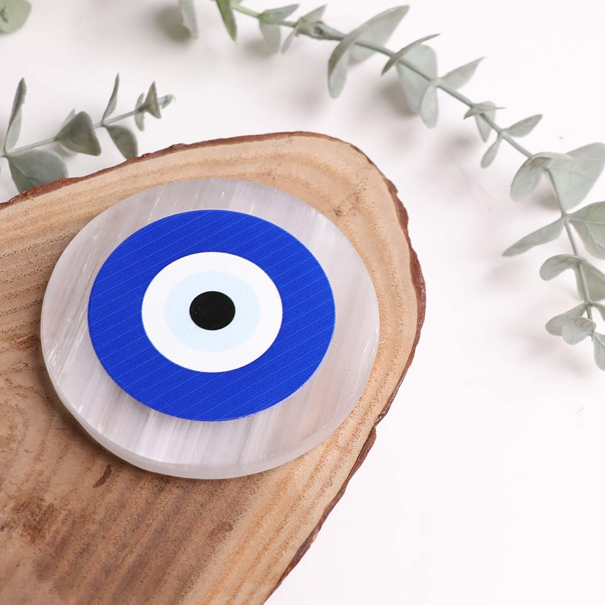 Sales Package: Includes 1 Evil Eye Selenite Round Plate Ideal for crystal charging and everyday spiritual practices.