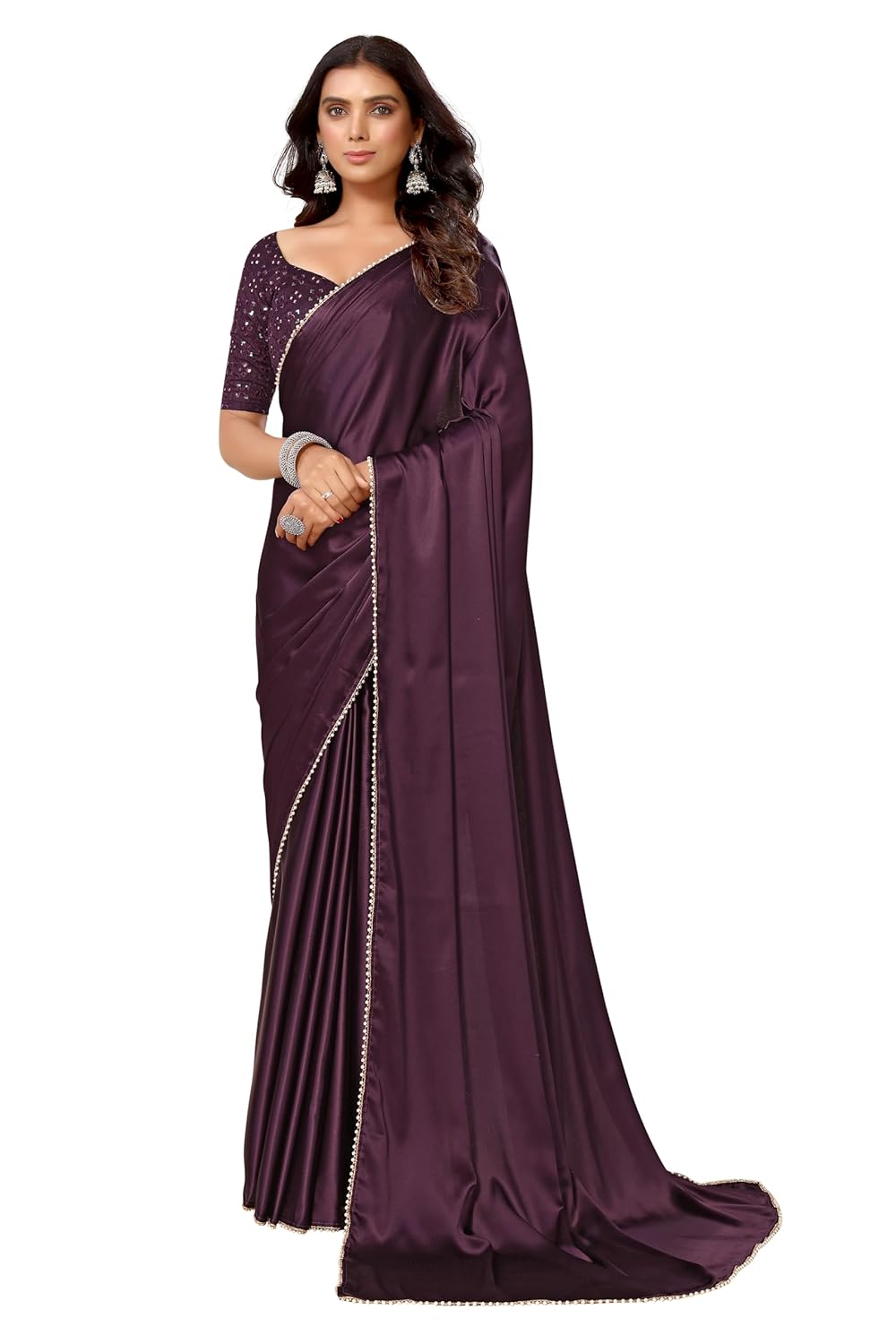 Fabian Fashion Women’s solid satin saree with all over pearl lace border and unstitched blouse piece.