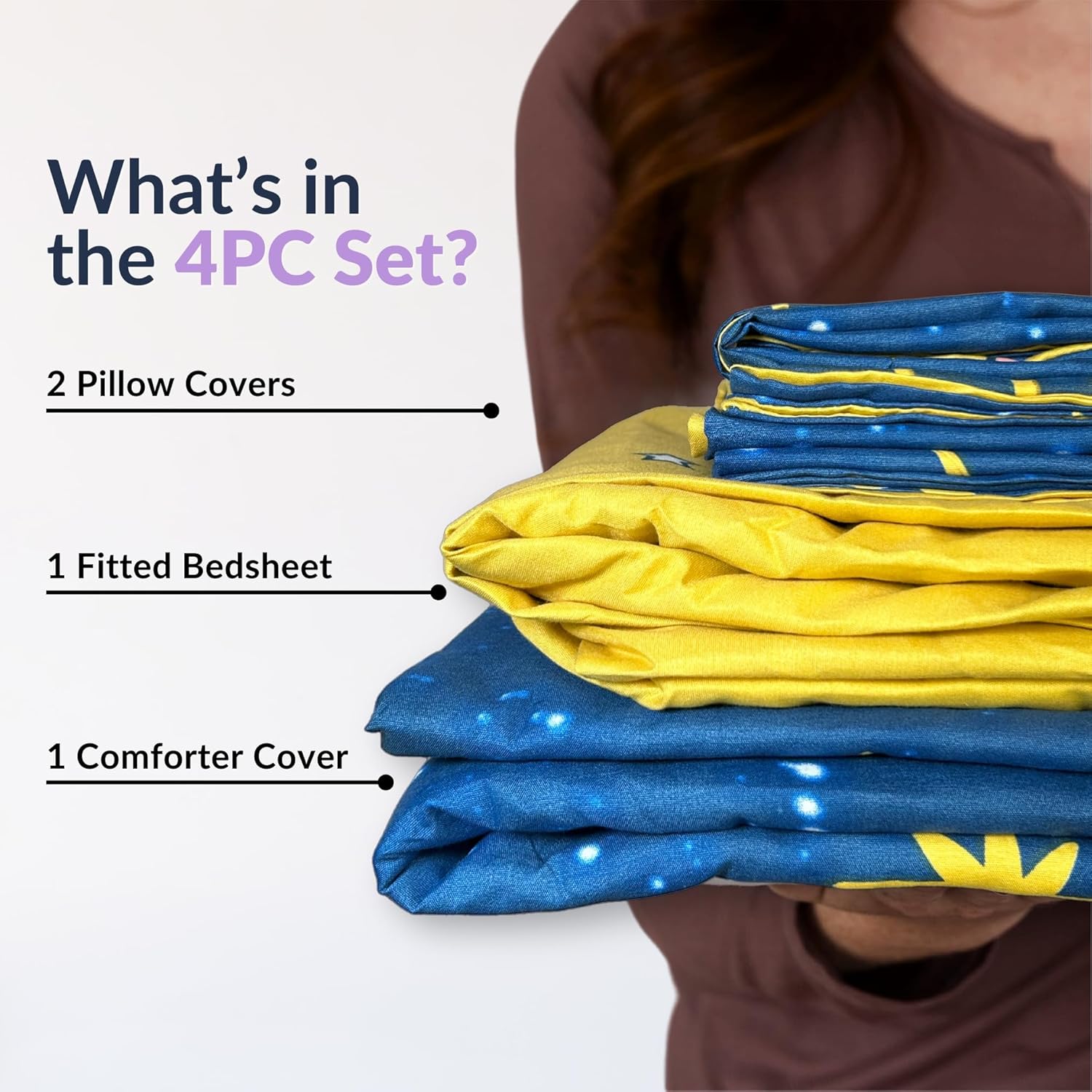 Both the fitted bedsheet and comforter cover are machine washable. Just remove, wash, and reuse with ease.