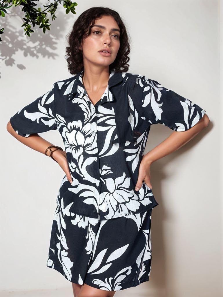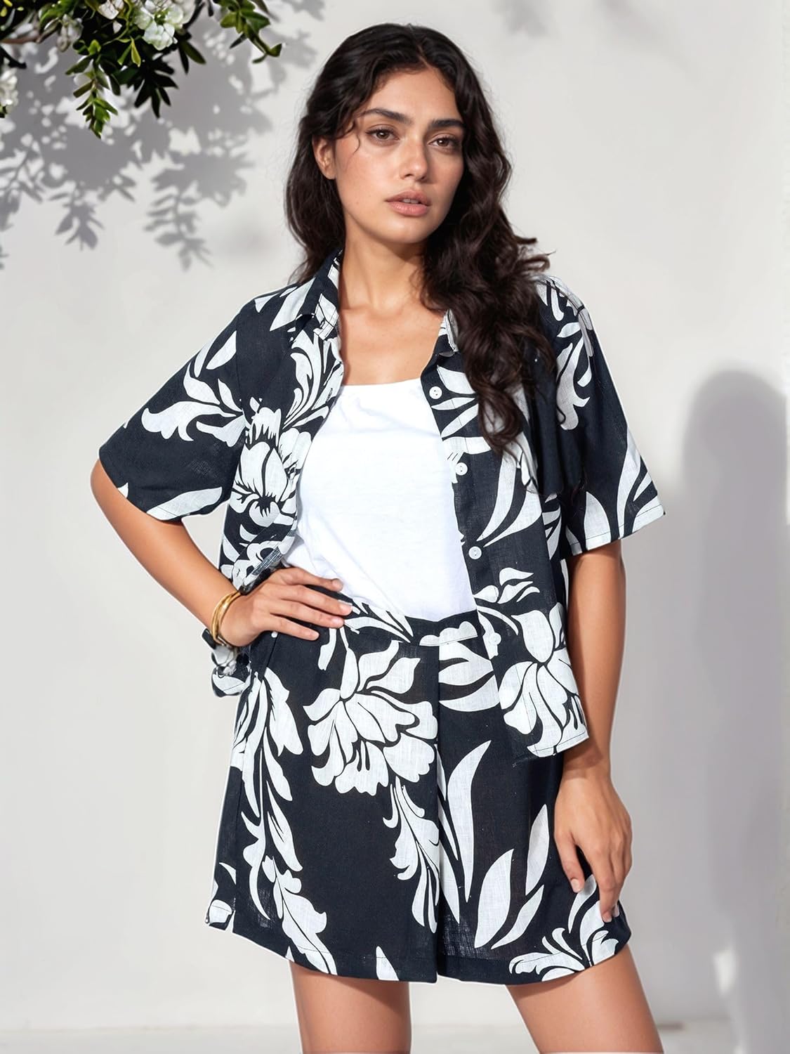 Elevate your casual wardrobe with this Black & White Quirky Printed Cord Set. The set includes a short, cropped shirt featuring a spread collar and a stylish open-shirt look. Crafted from a comfortable cotton blend fabric, the short has a back elastic waist for a flattering fit. Perfect for a trendy, relaxed look, this cord set combines playful prints with modern design.