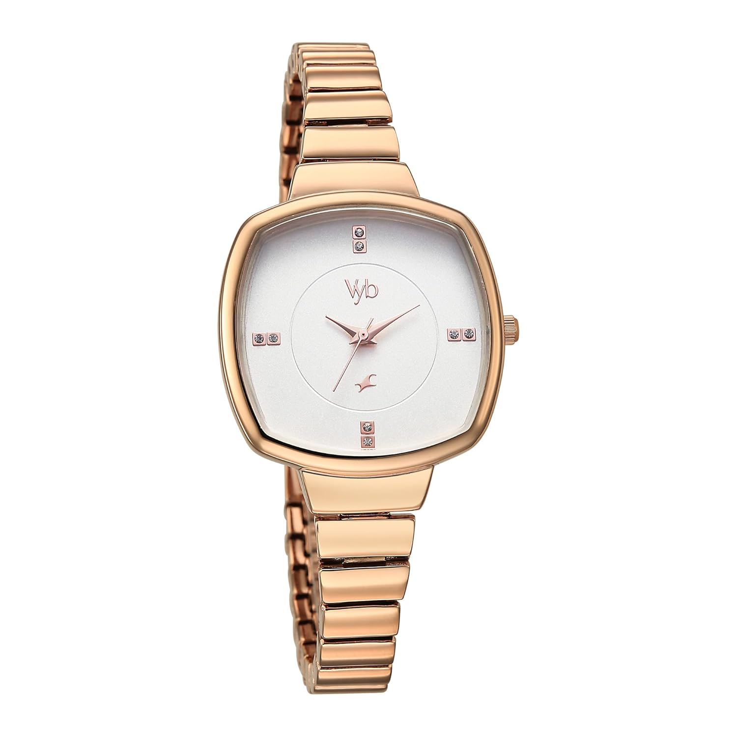 Illuminate your party look with the Fastrack Vyb Muse in rose gold. This elegant watch features a cushion shaped case, a matte white dial adorned with crystal indices, and a uniquely delicate strap design. With its graceful silhouette and refined details, the Vyb Muse adds just the right touch of glamour and sophistication to your evening ensemble—perfect for when you want your style to speak softly but shine brightly. Case Dimension :33.3 X 41.6 X 7.9 | Metal Strap| Stainless steel back cover | 1 Year limited warranty on manufacturing defects and plating