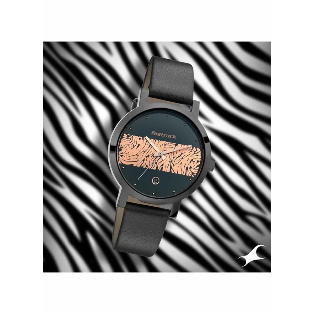 Fastrack Animal Print Quartz Analog with Date Bicolour Black Dial & Band Leather Strap Watch for Girls-NR6222NL01