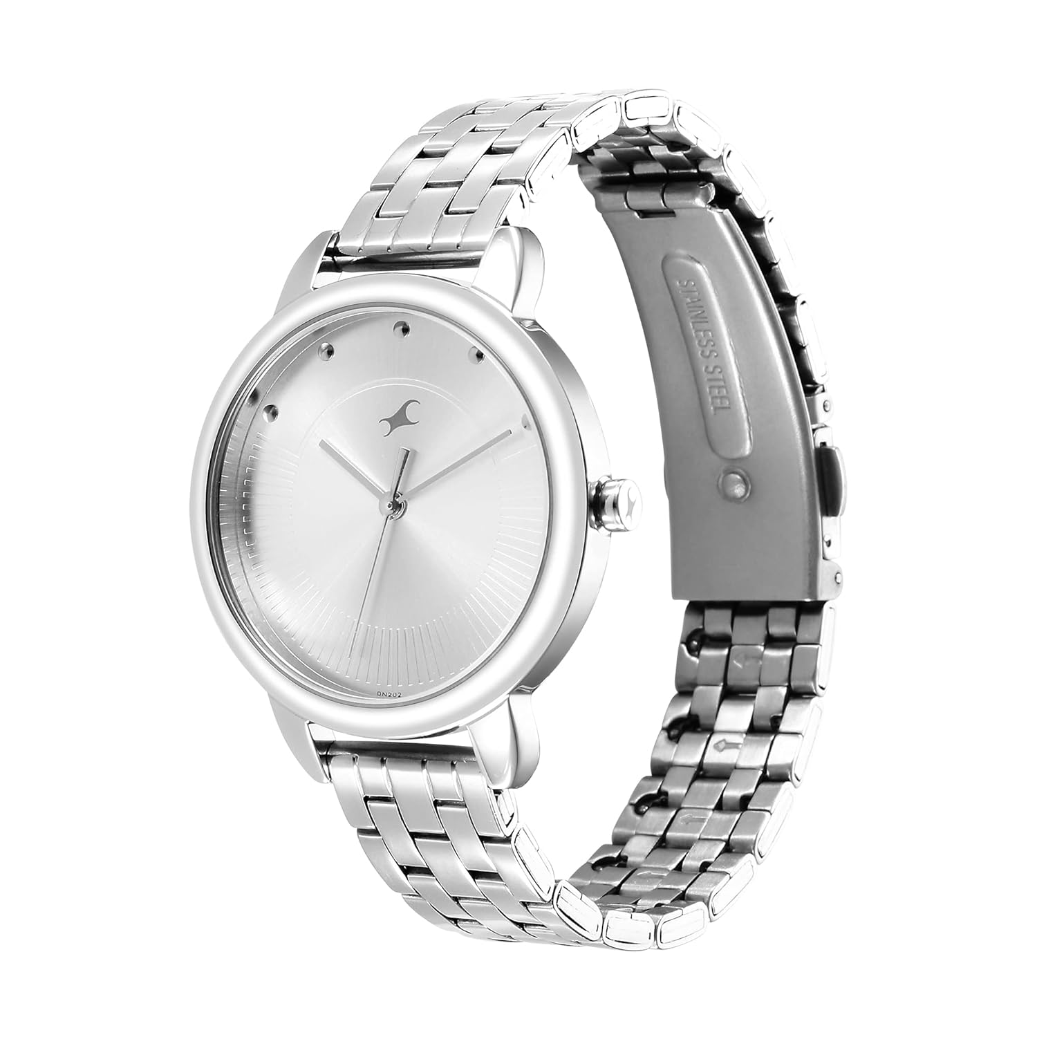 Shine bright with timeless elegance wearing the Fastrack Stunners. This sleek and versatile watch features a polished silver dial paired with a matching silver metal strap, delivering a minimalist yet bold look perfect for girls who love modern metallics. The stainless steel strap adds durability and shine, while the quartz movement ensures precise timekeeping. Whether you’re heading to college, brunch or a special occasion, this silver-toned timepiece elevates every outfit with effortless style. A true stunner in every sense, Its the perfect blend of classic sophistication and youthful charm.