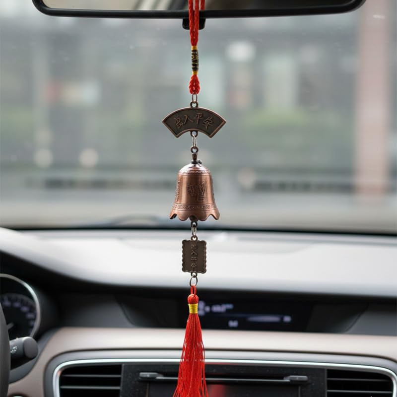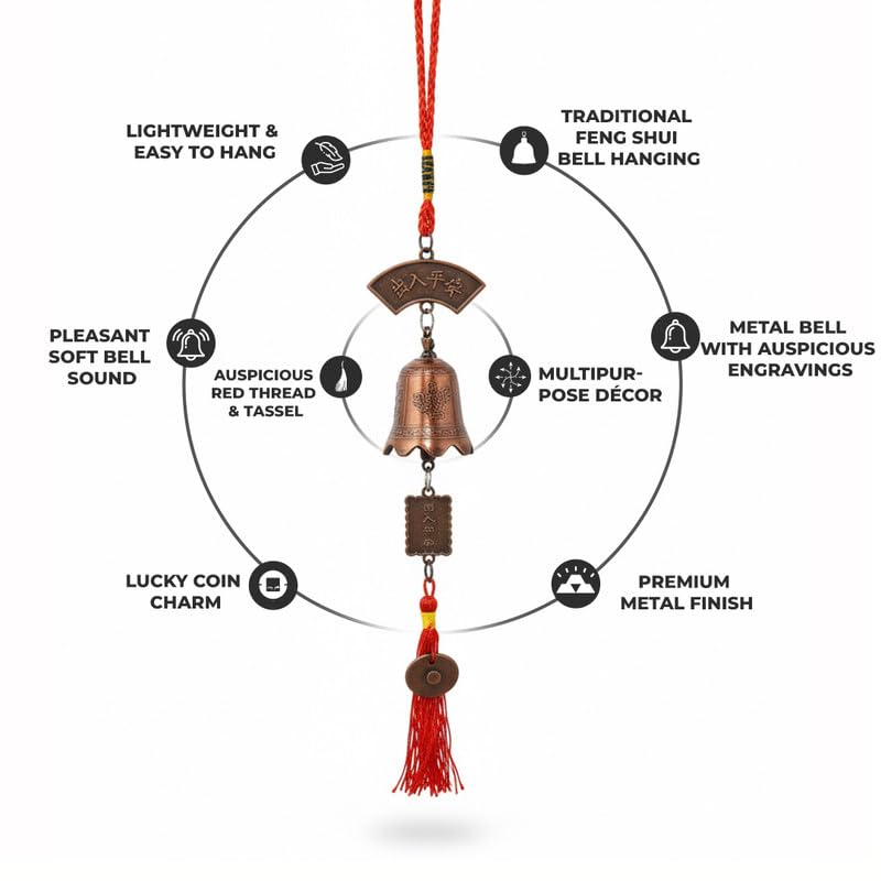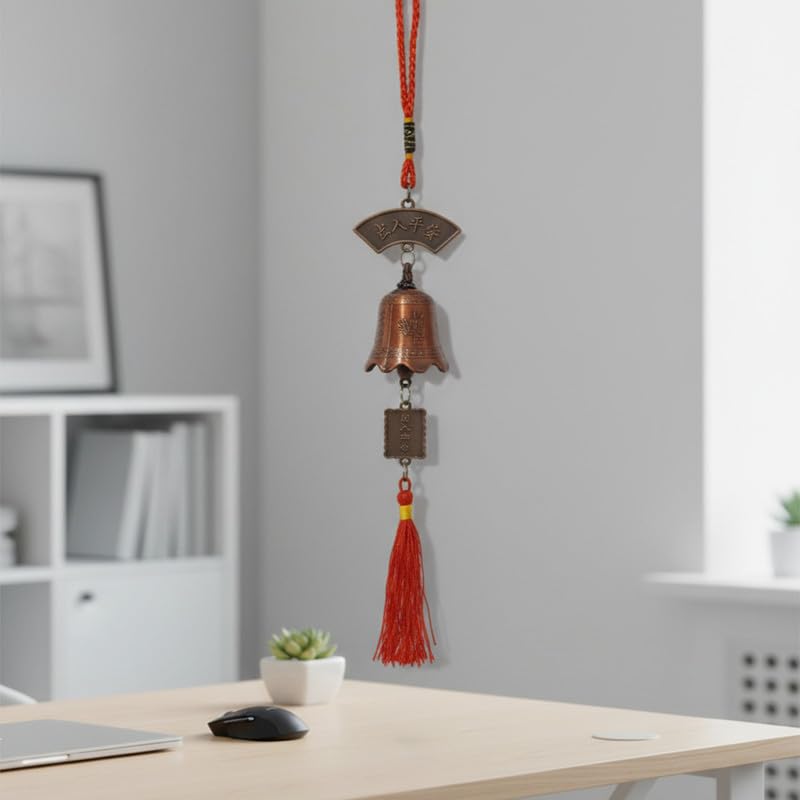 Feng Shui Tibetan Hanging Bell for Home & Office | Decorative Wall Hanging Bell with Red Tassel | Vastu & Spiritual Home Decor | Compact Metal Bell