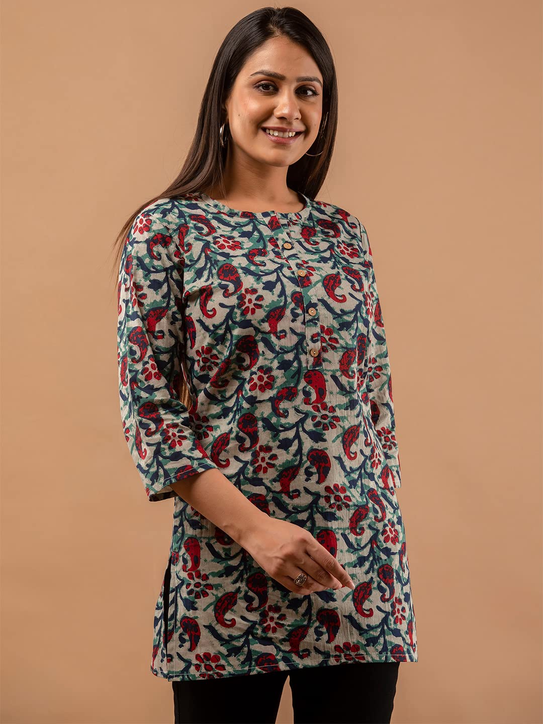 Fabric : CottonStyle : Straight Fit KurtiSleeves : Three- QuarterSide SlitsNeck : MandrinWooden Buttons for closure