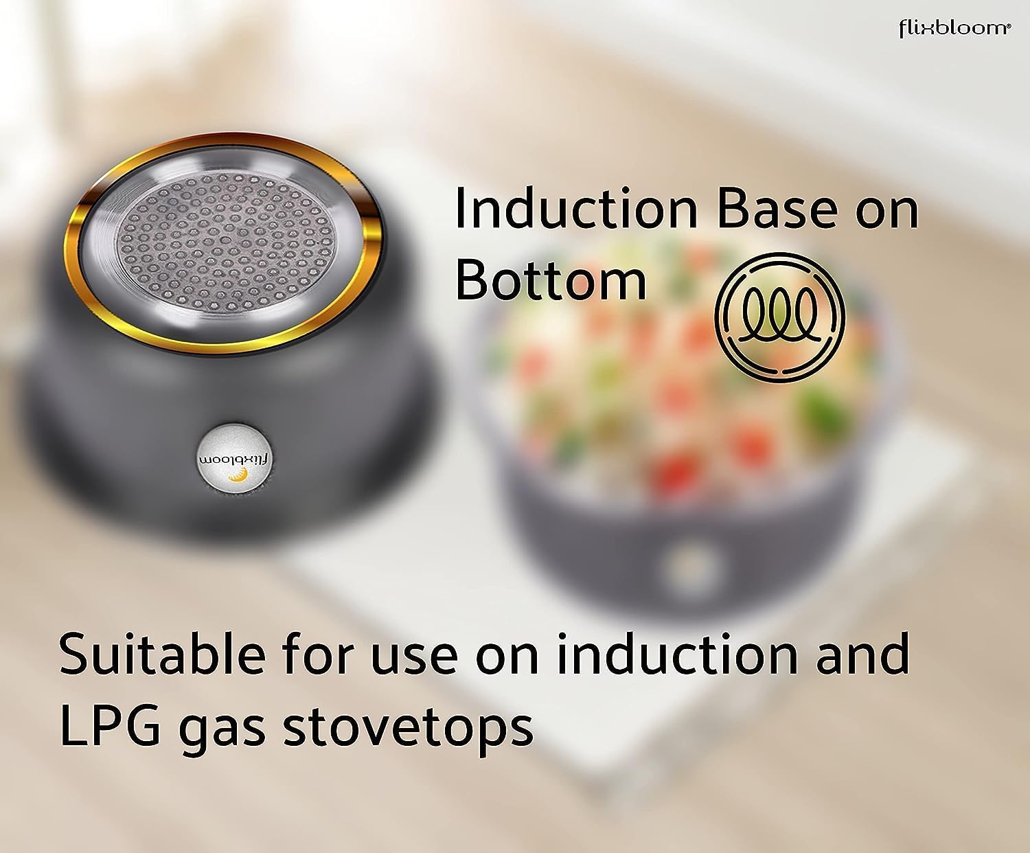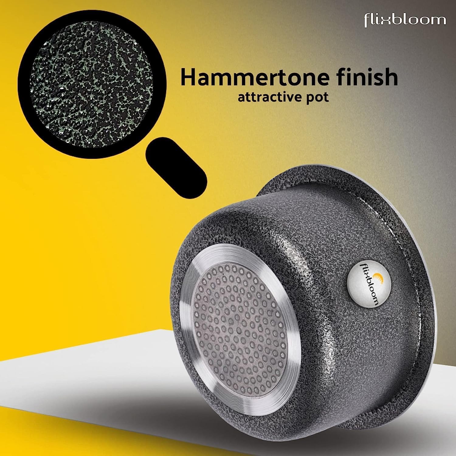 Flixbloom Induction Bottom Tope is crafted from finest quality Aluminium . It finest Hammertone finish finishing which adds Style to your Kitchen to look more beautiful and well decorated. Its bonded construction of bottom consists of durable SS encapsulating an Aluminium core for even heating throughout. Flixbloom Tope Cookware are carefully designed and fabricated with compliance with industry standards. This Flixbloom cookware Tope / Patila / Bhagona is manufactured under Strict Quality control. This tope is strong, durable and convenient to clean & wash. Dishwasher Safe Exterior Adds Versatility and Functionality.