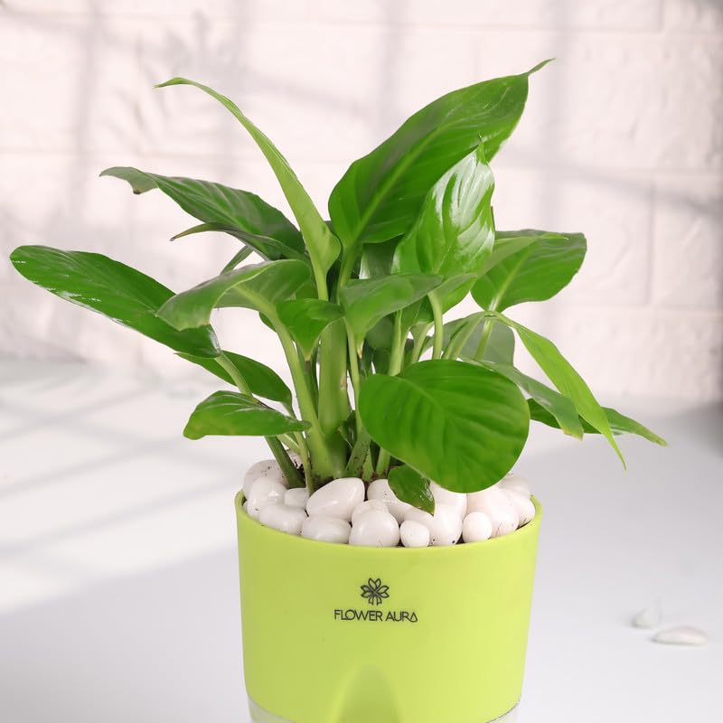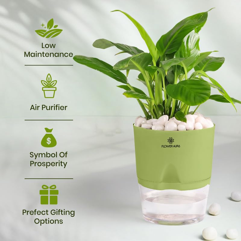 FlowerAura Live Indoor Peace Lily Plant In Green Self Watering Pot Perfect For Living Room, Balcony, Home/Office Decor – Ideal For Gifting, Improving Air Quality, Reducing Stress (Same Day Delivery)