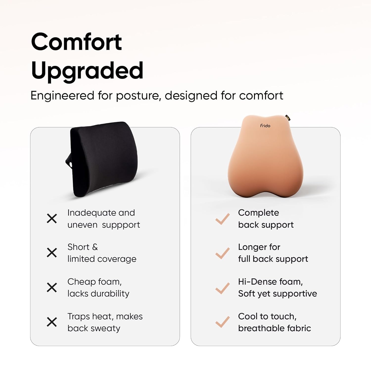 Frido Cloud Backrest Cushion – Experience superior comfort and support with the perfect back cushion for office chair and study chair users who spend long hours sitting. This ergonomically designed back support cushion aligns with the natural curve of your spine, helping reduce pressure, lower back pain, and fatigue. It’s one of the best lumbar back support cushions out there that guarantees even support and cloud-like, soft cushioning. Whether you need a backrest for your chair at work or home, the Cloud Backrest adapts seamlessly. Lightweight and portable, it transforms any seat into an orthopaedic haven with ultra-responsive and high-density memory foam. The adjustable strap ensures a secure fit on any chair back rest in seconds. Plus, the cover is breathable and machine-washable so it keeps you cool all day and ensures effortless maintenance. Perfect for professionals, students, and anyone who needs a reliable and durable backrest for chairs, this back pillow is your go-to chair cushion for daily comfort. Available in 5 colours to match any aesthetic or mood, it’s the ultimate comfort solution.