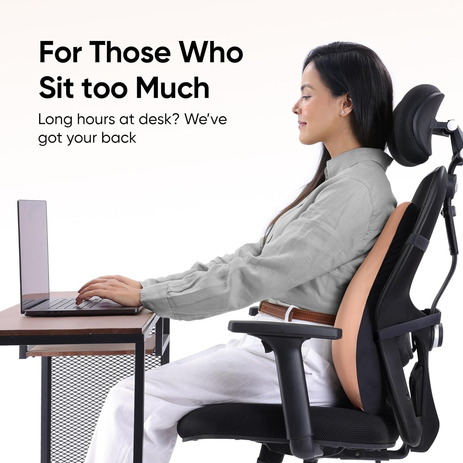 Complete Back Support: Ergonomic design that covers the entire back, focusing on lumbar support for better posture, zero discomfort, and back pain relief.