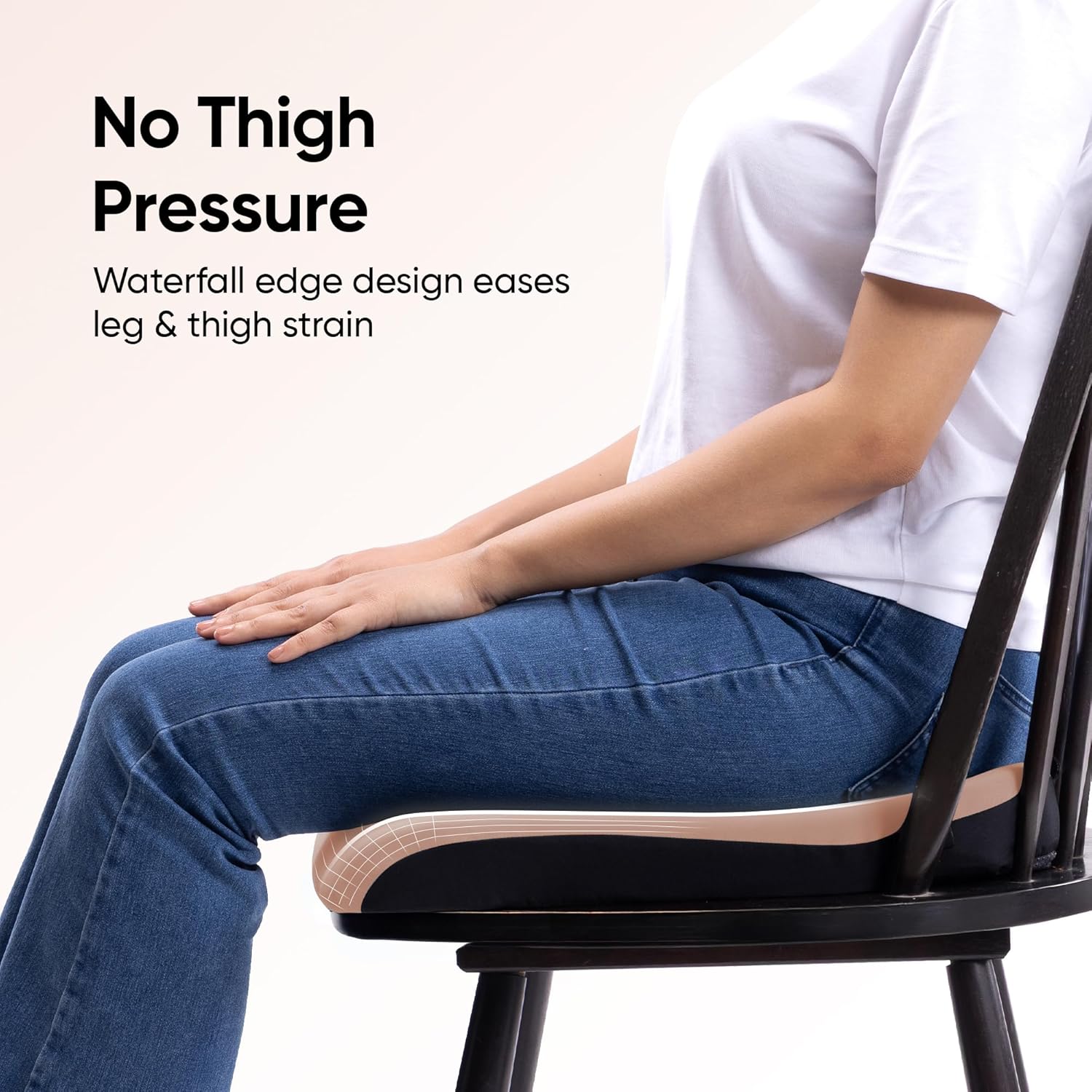 Ergonomic Memory Foam: Designed to adapt various body shapes, this cushion relieves pressure on the tailbone and thighs, improves posture, and supports better blood flow during long sitting hours
