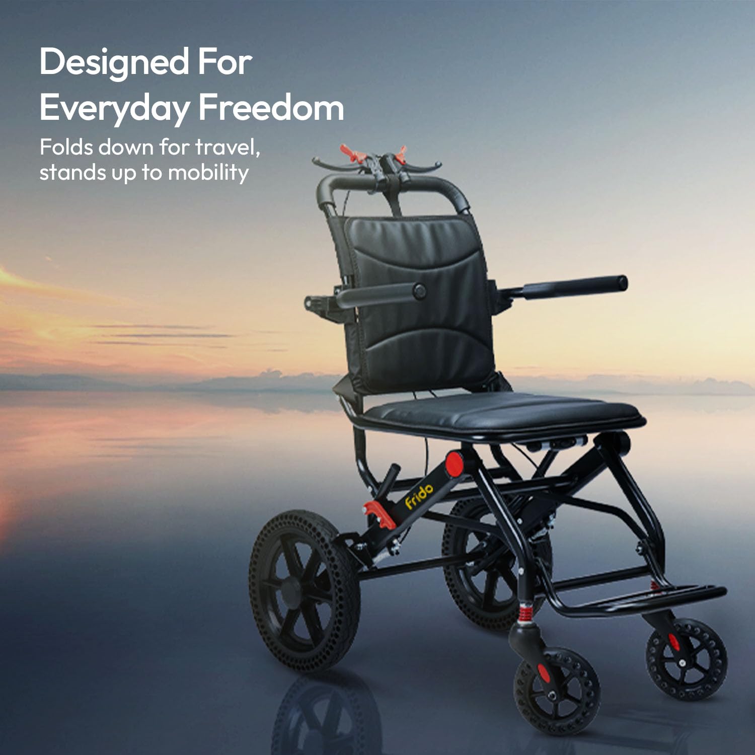 Compact Storage: Unlike traditional foldable wheel chairs for old people, the Frido Travel Wheelchair features a space-saving fold that lets you tuck it away with minimal effort. Whether you need a folding wheelchair for travel, a stair climbing wheelchair, or a wheel chair for an old age person foldable and easy to carry, Frido makes mobility effortless.