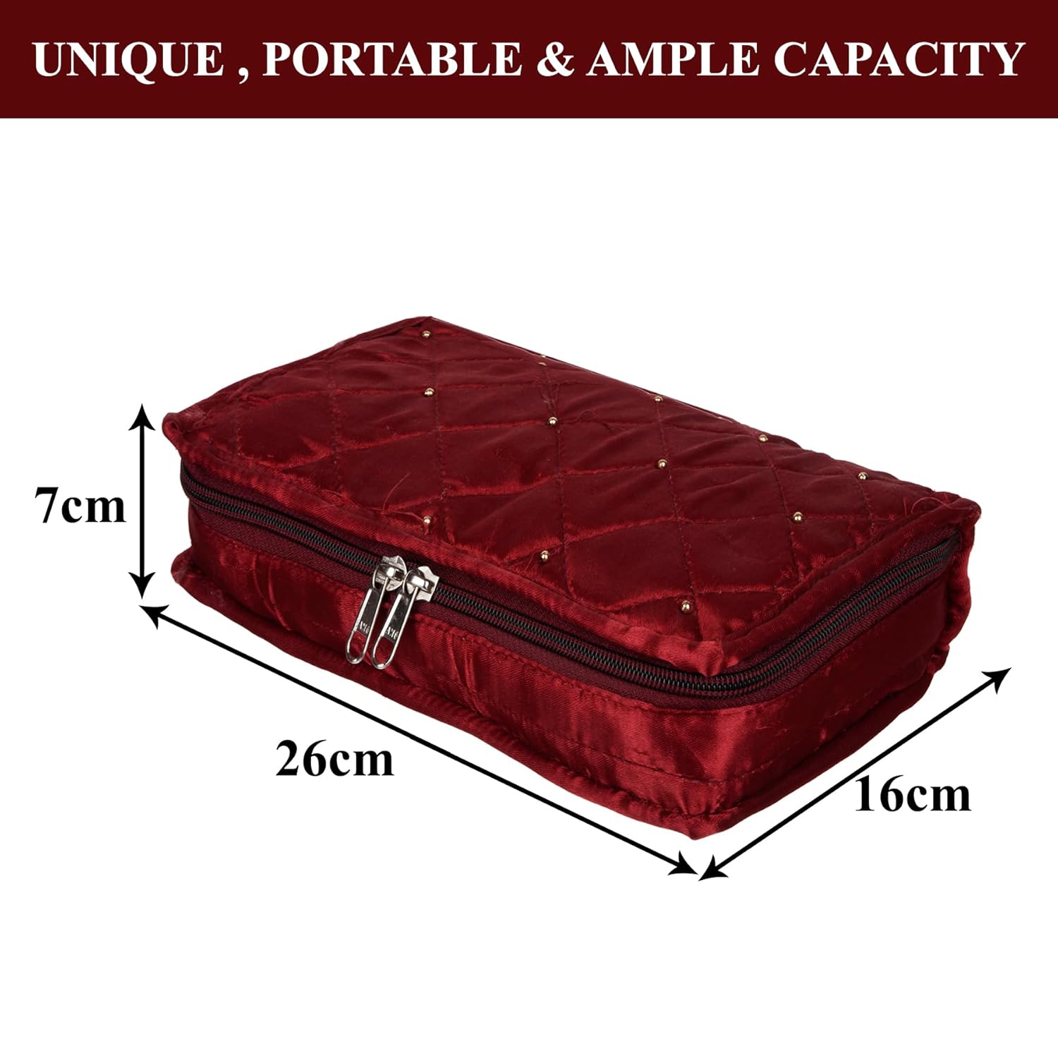 Fun Homes Satin Cosmetic & Jewellery Kit Organisers with Zip & 6 Flappable Inner Pouch Pocket | Moti Beads Design Jewellery Pouches for Storage | Travel Makeup Kit Organizer Box | Maroon
