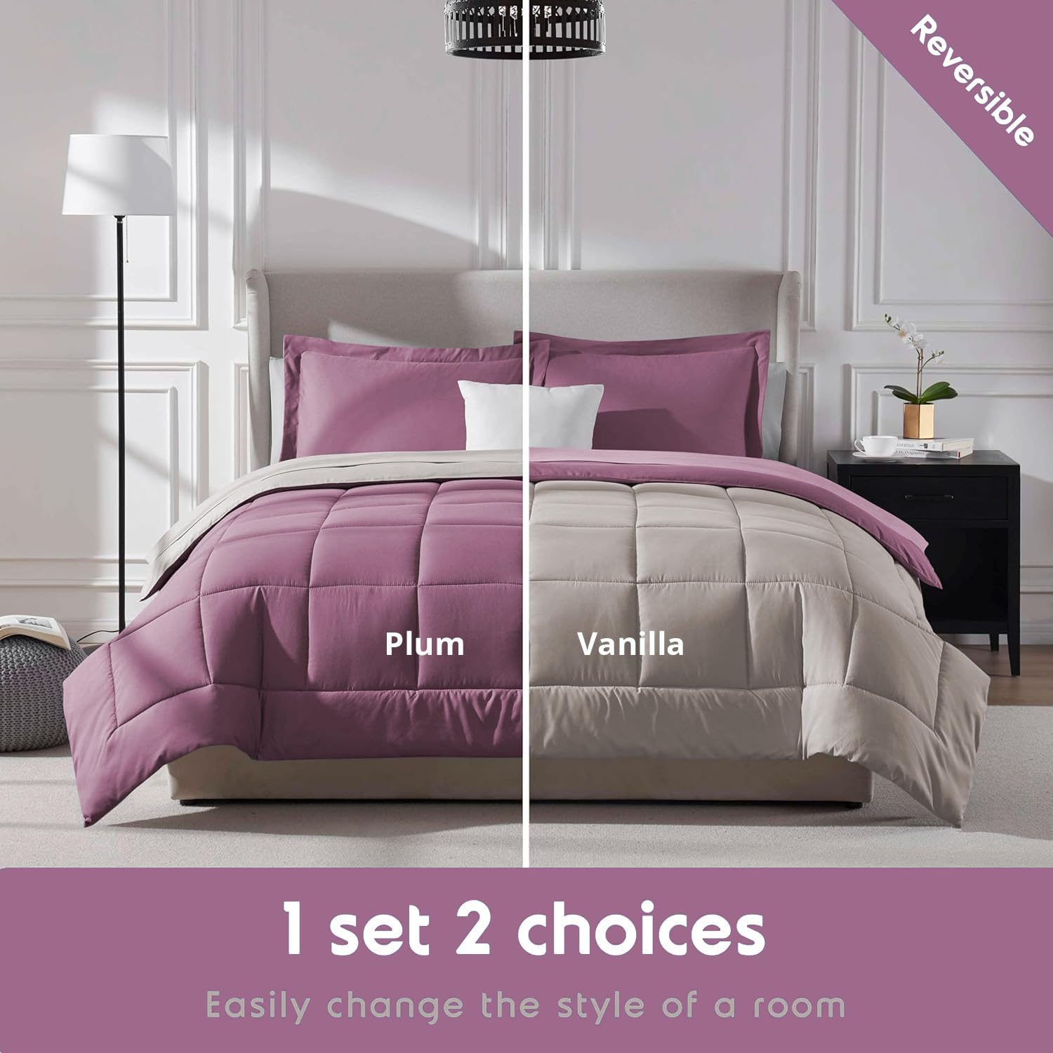 FURBO Microfiber Reversible 200 GSM AC Comforter Set Double Bed with 2 Pillow Covers, Quilt for Double Bed King Size for All Season Comfort (90×100 Inches, Plum & Vanilla)