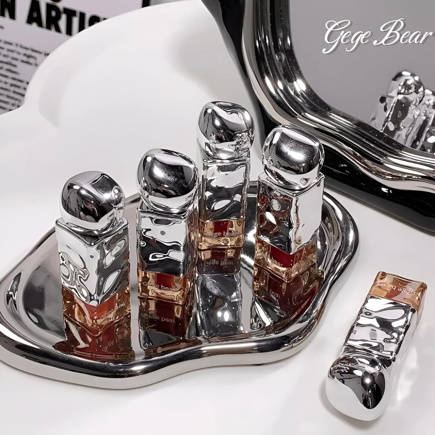 📦 Sleek Metallic Packaging Design – Each liquid lipstick comes in an Instagram-worthy reflective silver container with abstract black and white patterns, featuring the signature Gege Bear branding that’s perfect for Gen Z aesthetics, travel convenience, and creating stunning makeup flat-lay photography for social media content.