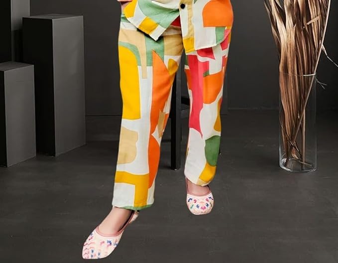 Experience the vibrant and playful charm of this stylish two-piece set for young girls. The outfit boasts a striking colour palette of warm hues like orange, yellow, and red, beautifully blended with cooler tones of green and white in an abstract geometric pattern. The relaxed fit and lightweight fabric ensure utmost comfort, allowing unrestricted movement for all-day wear. The button-down jacket adds a touch of sophistication, while the matching trousers offer a chic and trendy look. Complete with a pair of adorable printed flats, this ensemble is perfect for making a fashionable statement at any occasion. Crafted with meticulous attention to detail, this set promises to keep your little one looking effortlessly stylish.