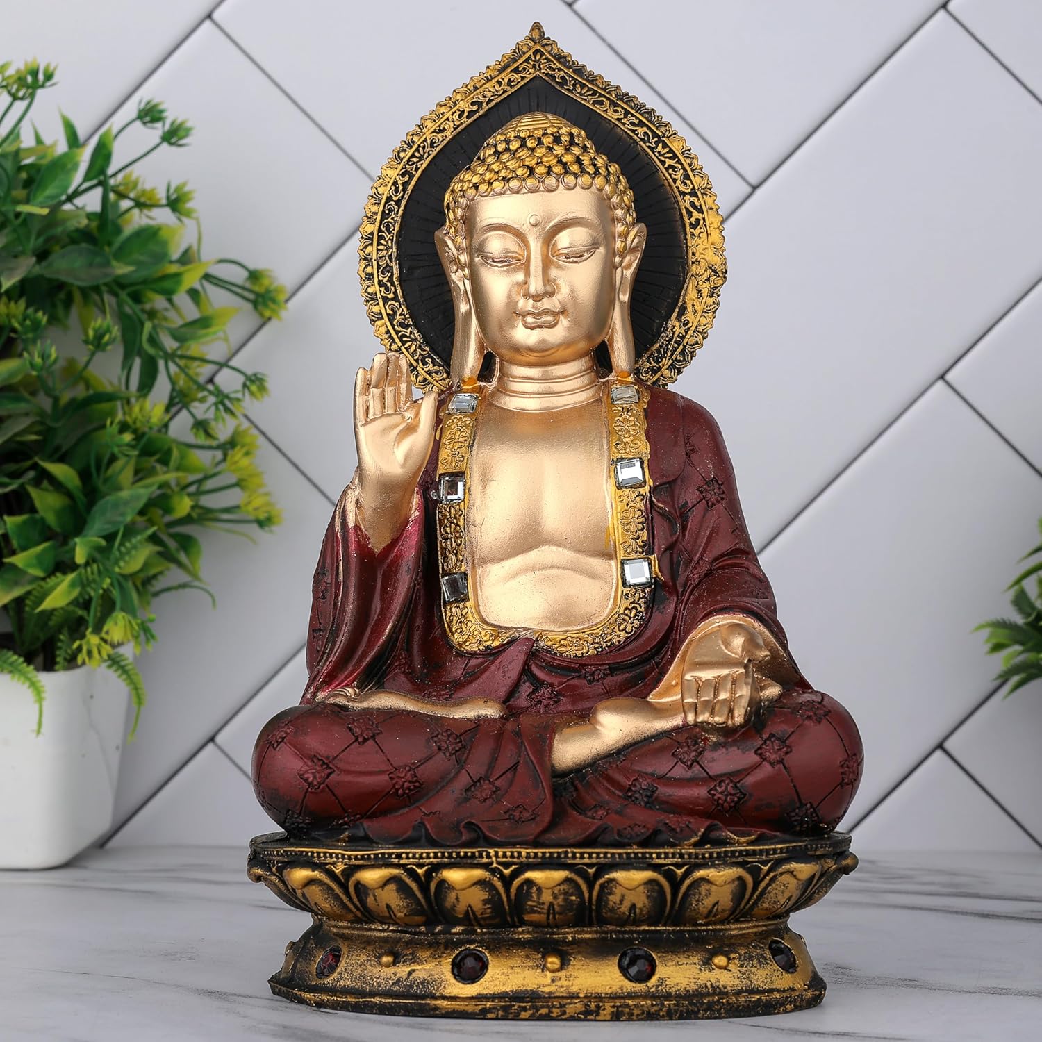 These beautiful lord gautam buddha statues for living room from the house of Global Grabbers on Amazon are a wonderful gifts and very beautiful home decor Items for living room bedroom These buddha show pieces for home decor are made From highest grade polyresin material and is handcrafted by skilled artisans using conventional techniques. Everyone wants perfect peace of mind that’s free from ignorance, greed, hatred and other afflictive states. Buddha Idol as home decoration items are always been a great symbol of peace. So, what could be a better gift or a better option to bring home than the idol of Buddha. This Buddha statue is a perfect piece of art for Home decoration and house warming gifts for new home . Elevate your home and garden décor with our exquisitely crafted Buddha statue, a perfect symbol of peace and spiritual enlightenment. this detailed Buddha statue is designed to bring serenity and mindfulness to any space. Whether placed in your living room, meditation room, office, or garden, its intricate hand-carved features and serene expression will create a calming atmosphere. Ideal for yoga studios and as a thoughtful anniversary gifts for parents wife or housewarming these Buddha statues not only enhances aesthetics but also promotes relaxation and positive energy. Embrace tranquility and spiritual growth by adding this elegant Buddha statue to your new home decor collection today.