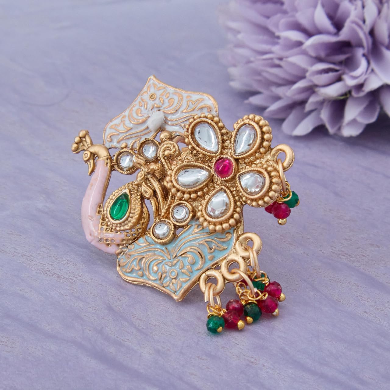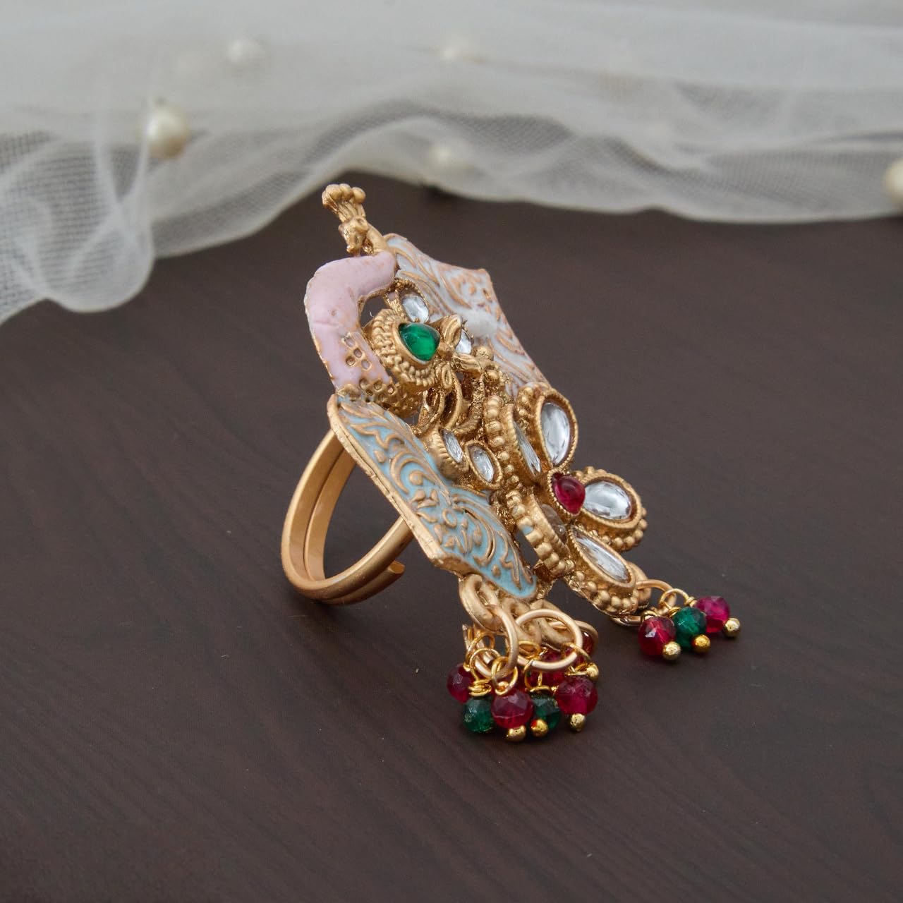 Gold Plated Antique Elephant Design Ring with Kundan Stones Beads and Enamel Work