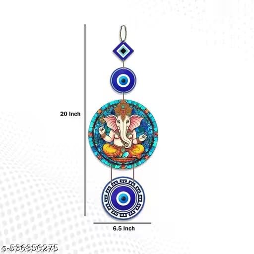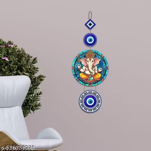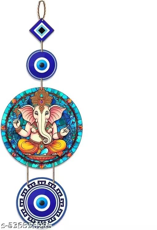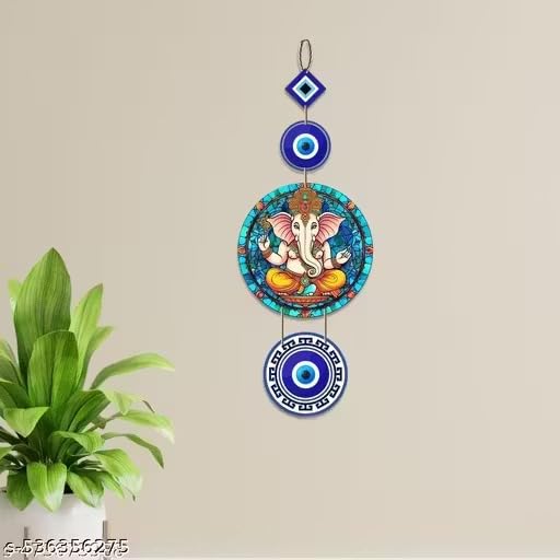 HANDCRAFTED DESIGN: Beautiful Ganesh Ji wall hanging with intricate detailing, featuring the beloved deity in vibrant colours surrounded by traditional evil eye motifs for spiritual protection