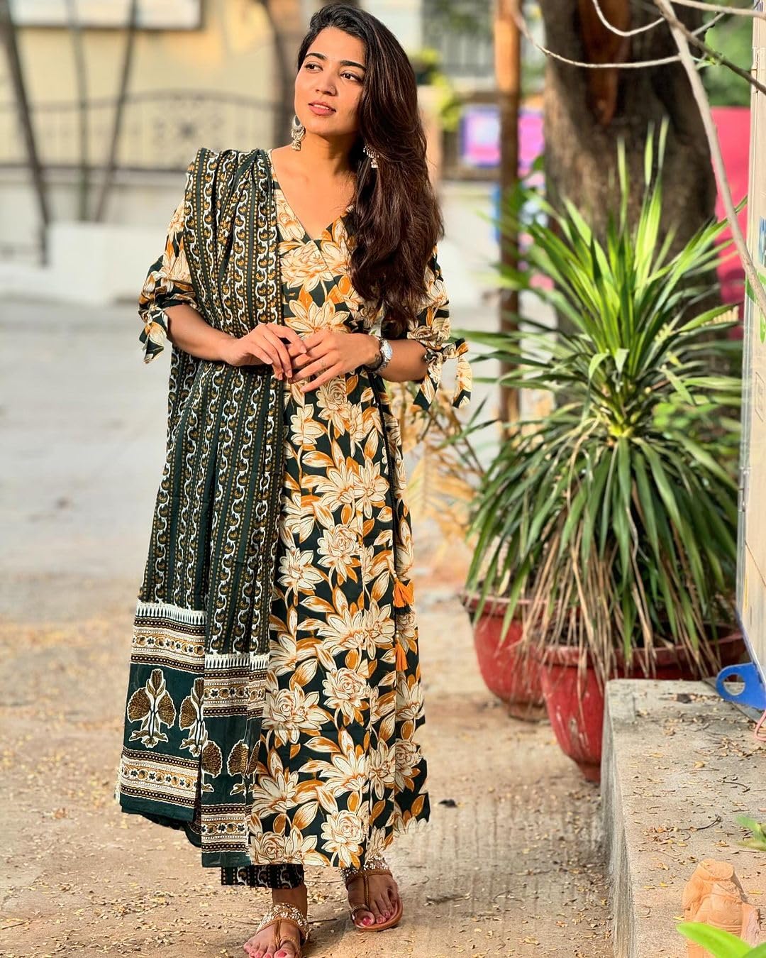 GoSriKi Women’s Rayon Blend Anarkali Printed Kurta with Pant & Dupatta